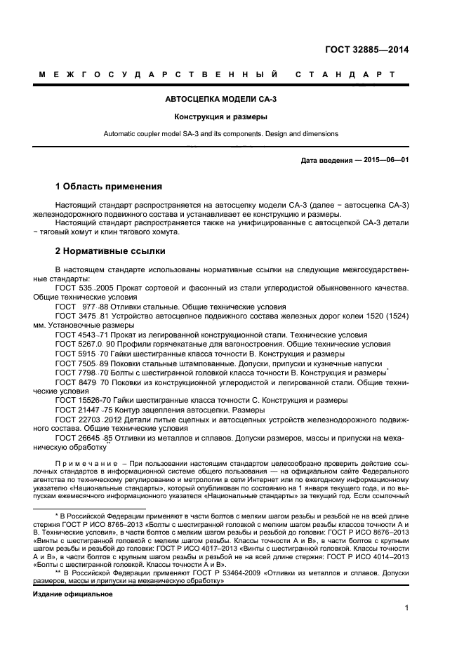 | Область и условия применения: | Настоящий стандарт распространяется на автосцепку модели СА-3 железнодорожного подвижного состава и устанавливает ее конструкцию и размеры.