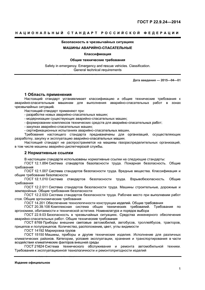 | Область и условия применения: | Настоящий стандарт устанавливает классификацию и общие технические требования к аварийно-спасательным машинам для выполнения аварийно-спасательных работ в зонах чрезвычайных ситуаций.