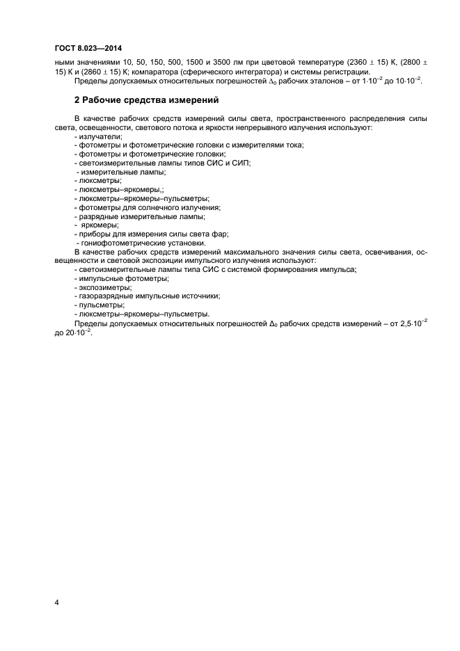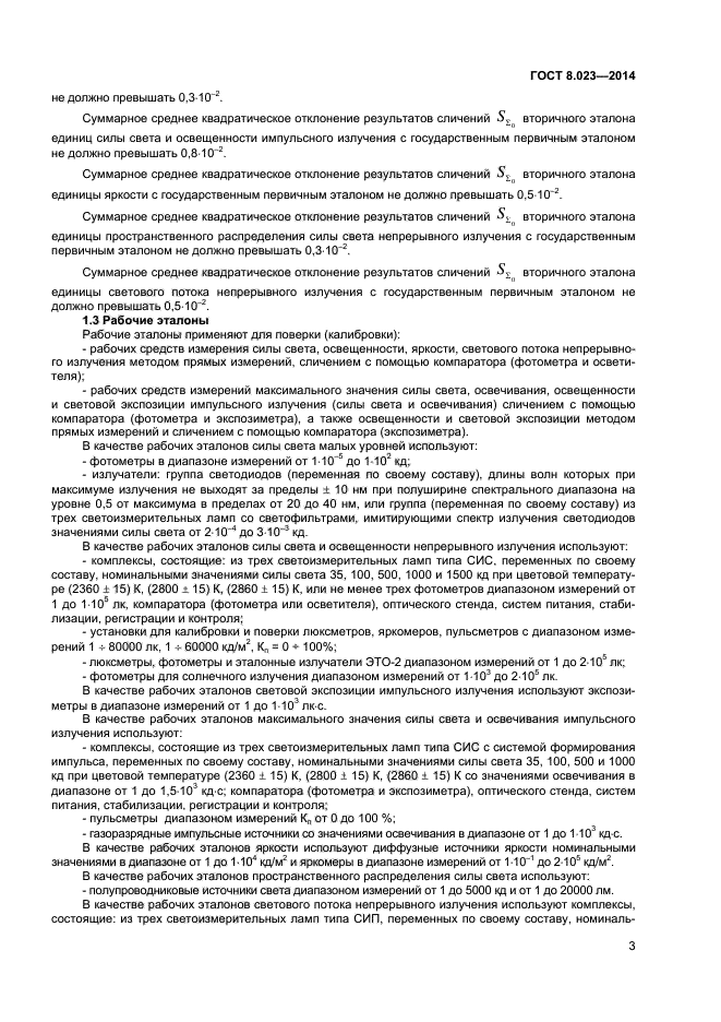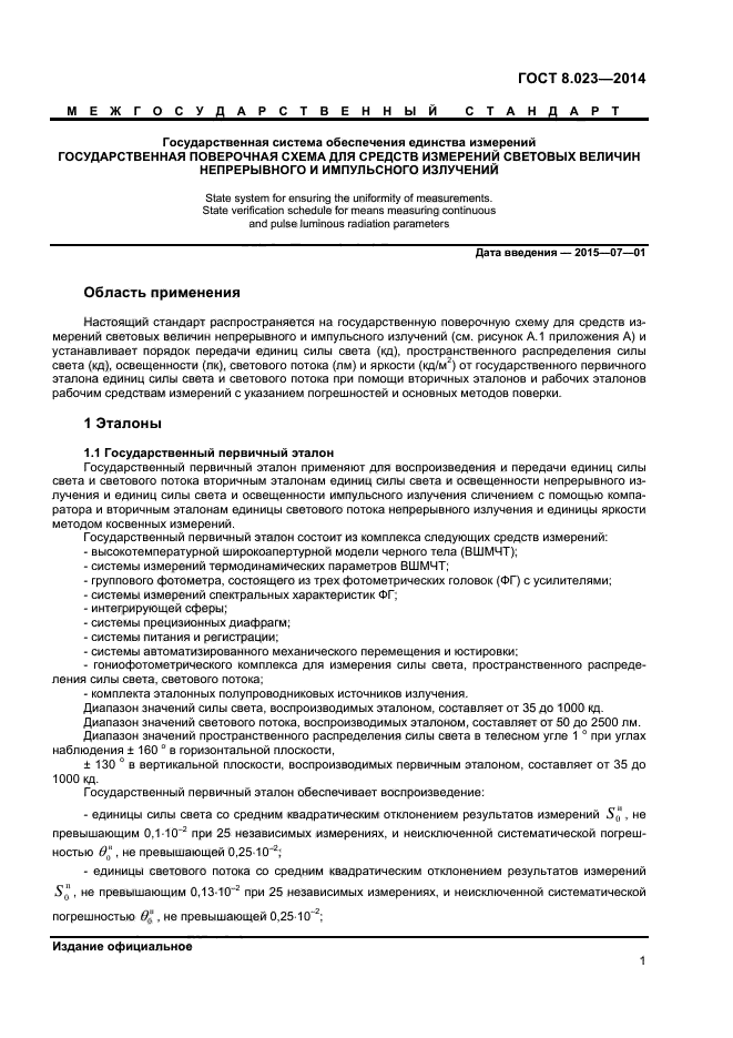 Настоящий стандарт распространяется на государственную поверочную схему для средств измерений световых величин непрерывного и импульсного излучений и устанавливает порядок передачи единиц силы света (кд), пространственного распределения силы света (кд), освещенности (лк), светового потока (лм) и яркости (кд/м2) от государственного первичного эталона единиц силы света и светового потока при помощи вторичных эталонов и рабочих эталонов рабочим средствам измерений с указанием погрешностей и основных методов поверки