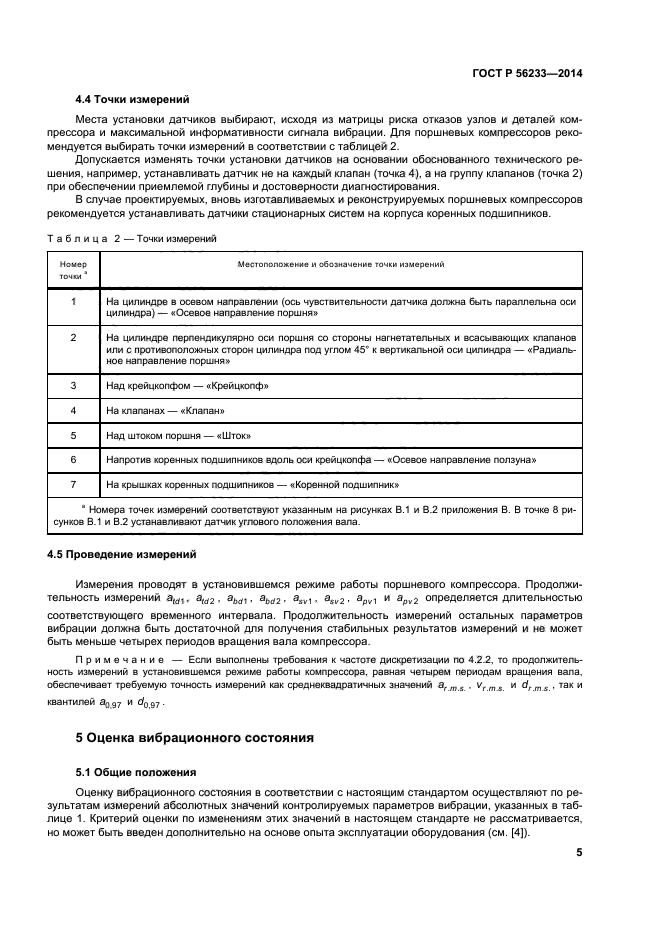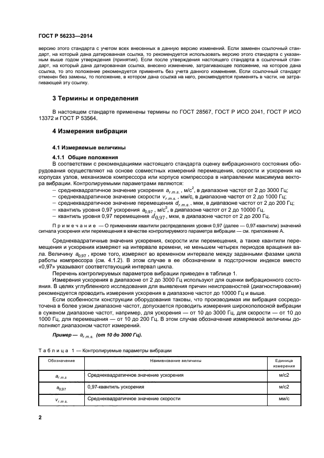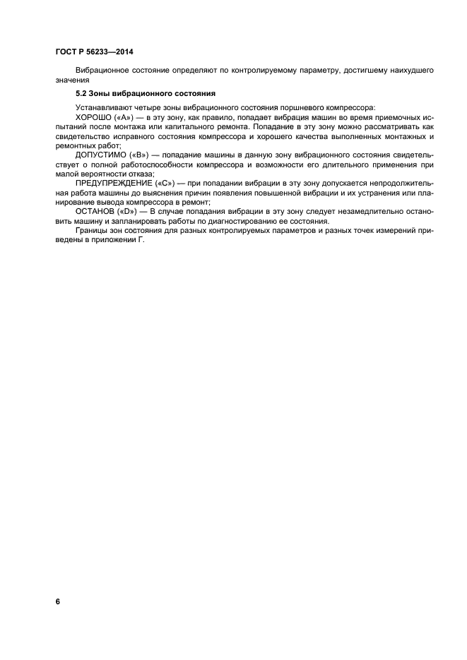 | Область и условия применения: | Настоящий стандарт распространяется на стационарные поршневые компрессоры групп Т2–Т6 по классификации [1], работающие с взрывоопасными газами, а также на стационарные поршневые компрессоры, работающие с вредными газами классов опасности 1 и 2 по ГОСТ 12.1.007, и устанавливает руководство по оценке их вибрационного состояния при эксплуатации и во время приемочных испытаний после монтажа и ремонта.