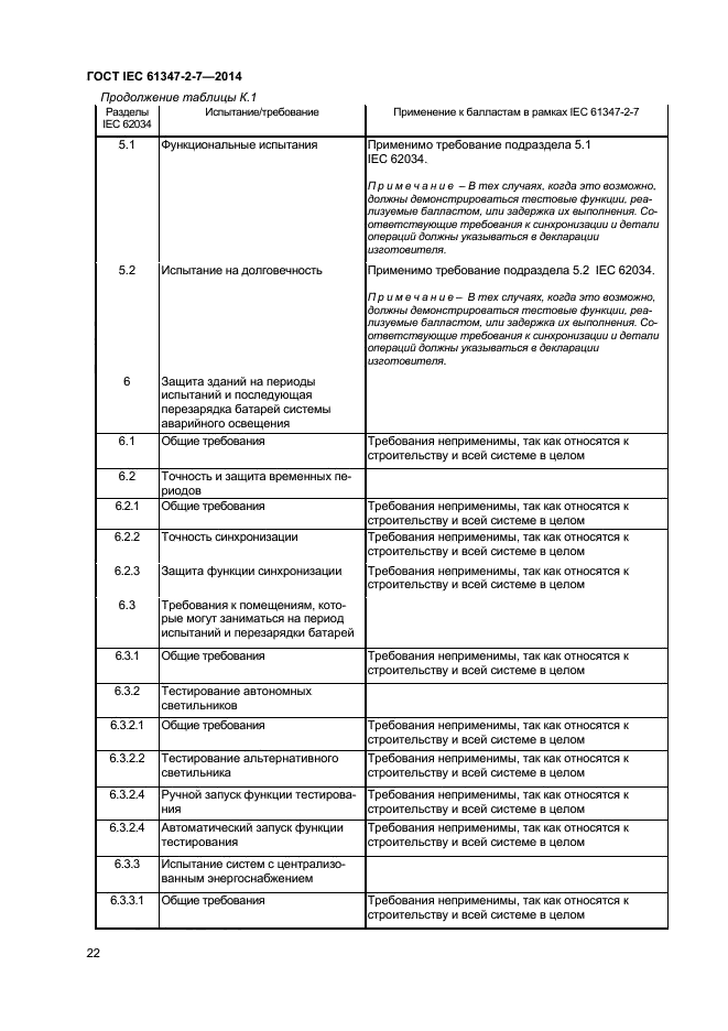 В эту часть включены конкретные требования к электронной аппаратуре управления и управляющим блокам для автономных светильников аварийного освещения, определенных в IEC 60598-2-22. Настоящая часть относится к управляющей аппаратуре люминесцентных ламп, но применима также к другим типам ламп: например, к лампам накаливания, газоразрядным лампам высокого давления и светоизлучающим диодам (СИДам). Настоящий стандарт охватывает операции аварийного режима работы управляющей аппаратуры. Применительно к аппаратуре, используемой и в нормальных, и в аварийных условиях освещения, аспекты нормального режима рассматриваются в соответствующей части 2 серии IEC 61347. Электронный пускорегулирующий аппарат для аварийного освещения, работающая на постоянном токе, может содержать, а может и не содержать питающие батареи. Настоящий стандарт включает также эксплуатационные требования к электронной управляющей аппаратуре, которые в случае использования источников постоянного тока рассматриваются как требования к рабочим характеристикам, поскольку неработающее осветительное оборудование создает угрозу безопасности. Требования настоящего стандарта неприменимы к управляющей аппаратуре постоянного тока, которая предназначена для подключения к системе централизованного аварийного энергоснабжения. Такой системой может быть и централизованная система батарейного питания |