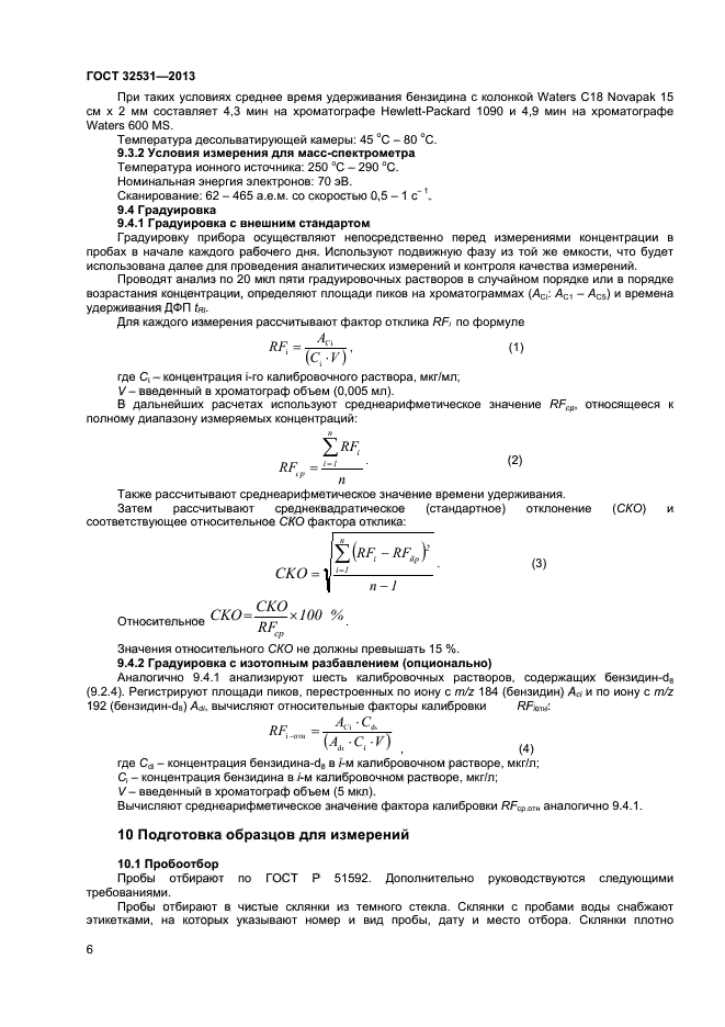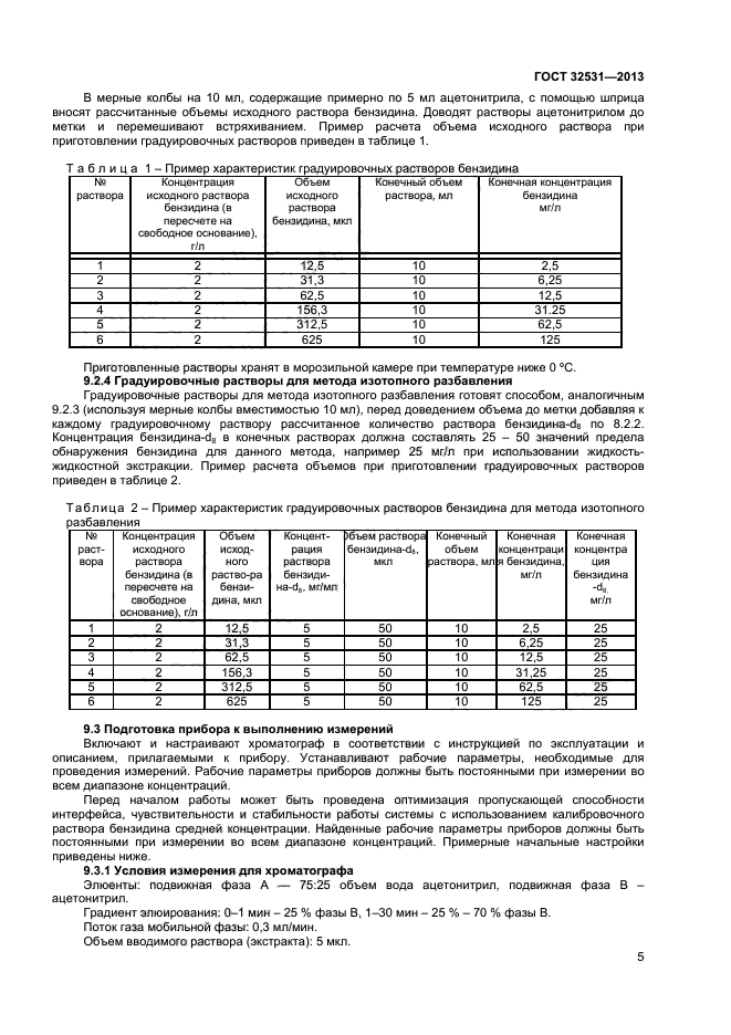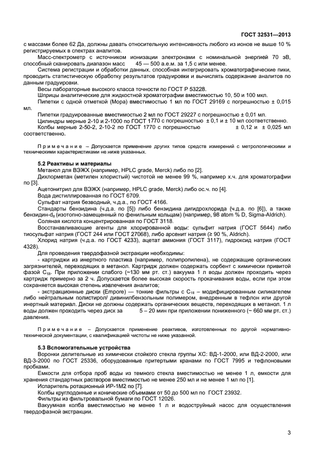 | Область и условия применения: | Настоящий стандарт устанавливает процедуру измерения массовой концентрации бензидина (4,4“-диаминодифенила) в пробах воды с пределом обнаружения в конечном экстракте 2,5 мкг/л (диапазон измеряемых концентраций 5–250 мкг/л) методом жидкость-жидкостной экстракции/высокоэффективной жидкостной хроматографии/масс-спектрометрии или с пределом обнаружения 5,3 мкг/л методом твердофазной экстракции/высокоэффективной жидкостной хроматографии/масс-спектрометрии. Такие результаты достигаются при объеме аликвоты образца 1 л и конечном объеме экстракта 0,5 мл, то есть при концентрировании образца в 2000 раз |