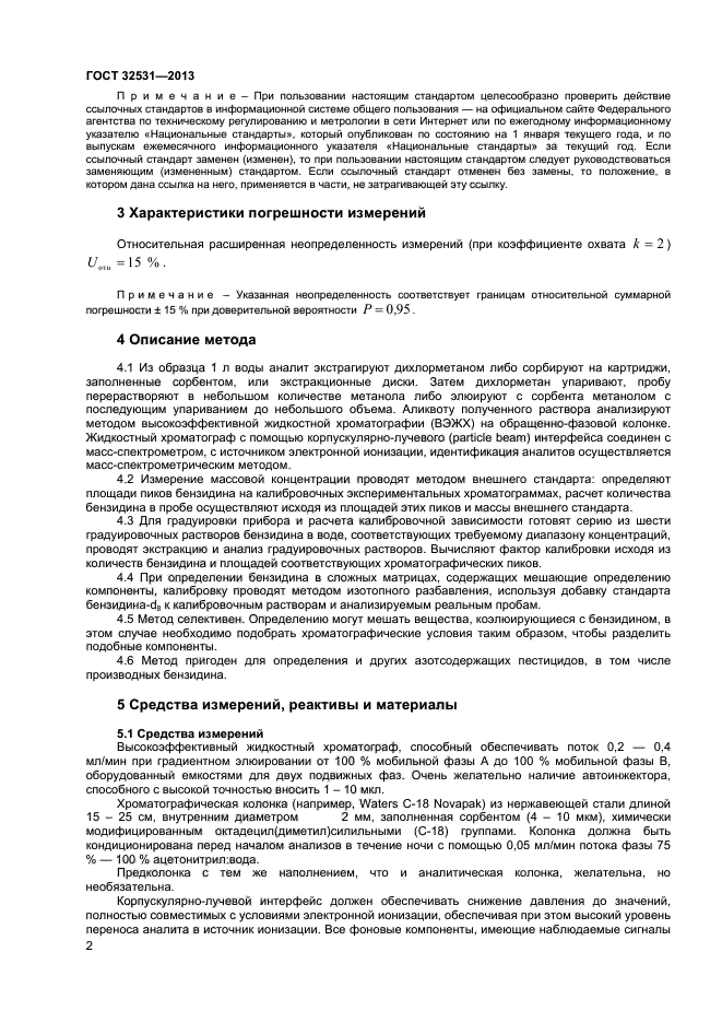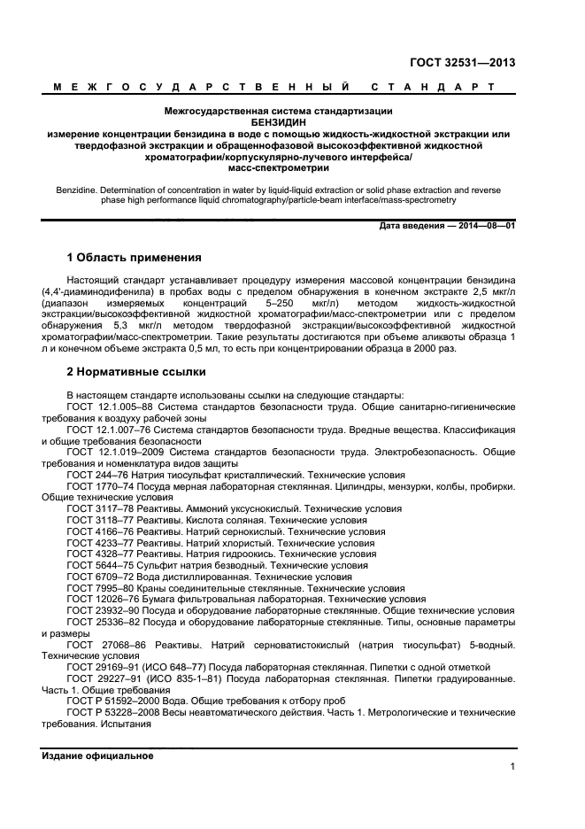Настоящий стандарт устанавливает процедуру измерения массовой концентрации бензидина (4,4“-диаминодифенила) в пробах воды с пределом обнаружения в конечном экстракте 2,5 мкг/л (диапазон измеряемых концентраций 5–250 мкг/л) методом жидкость-жидкостной экстракции/высокоэффективной жидкостной хроматографии/масс-спектрометрии или с пределом обнаружения 5,3 мкг/л методом твердофазной экстракции/высокоэффективной жидкостной хроматографии/масс-спектрометрии. Такие результаты достигаются при объеме аликвоты образца 1 л и конечном объеме экстракта 0,5 мл, то есть при концентрировании образца в 2000 раз