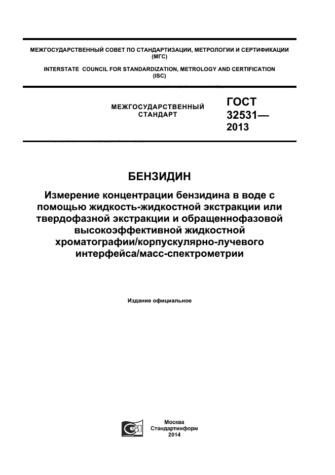 | Название рус.: | Бензидин. Измерение концентрации бензидина в воде с помощью жидкость-жидкостной экстракции или твердофазной экстракции и обращеннофазовой высокоэффективной жидкостной хроматографии/корпускулярно-лучевого интерфейса/масс-спектрометрии |