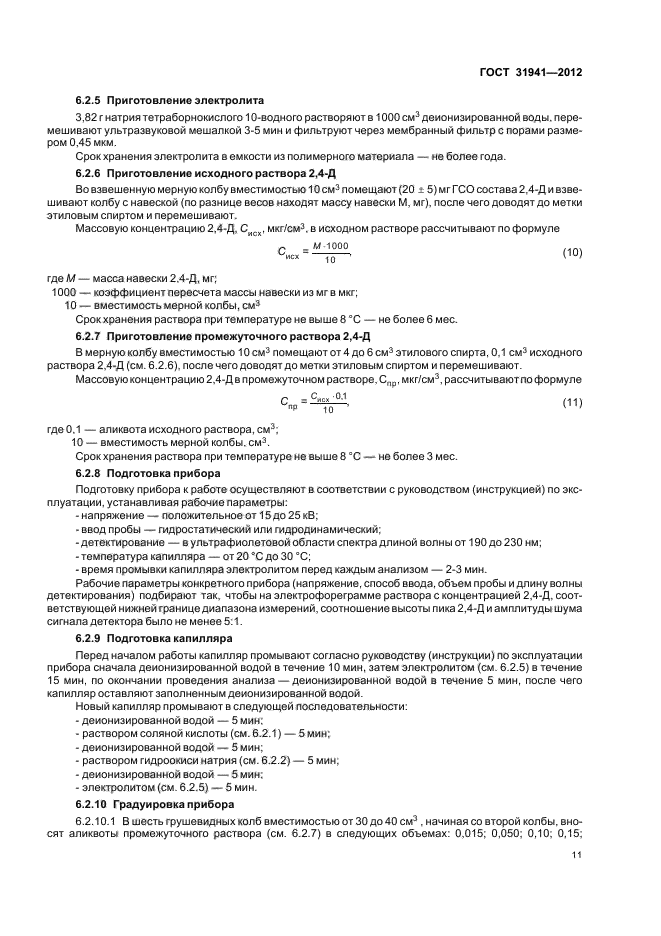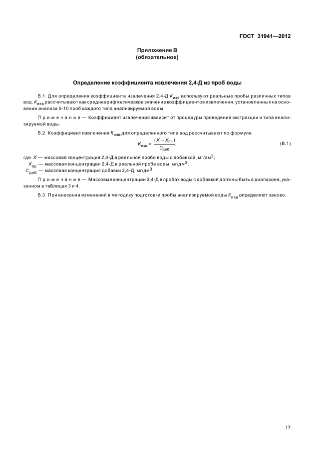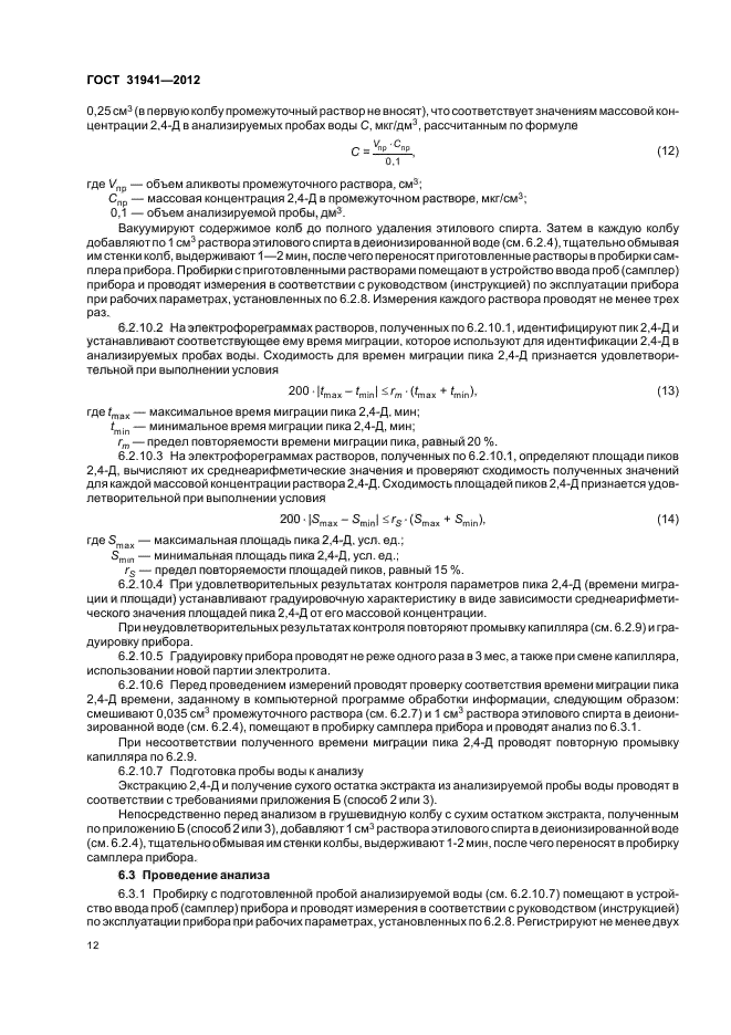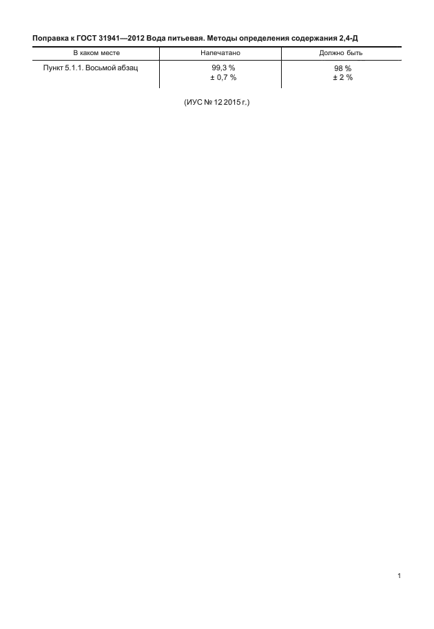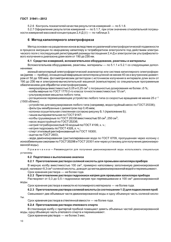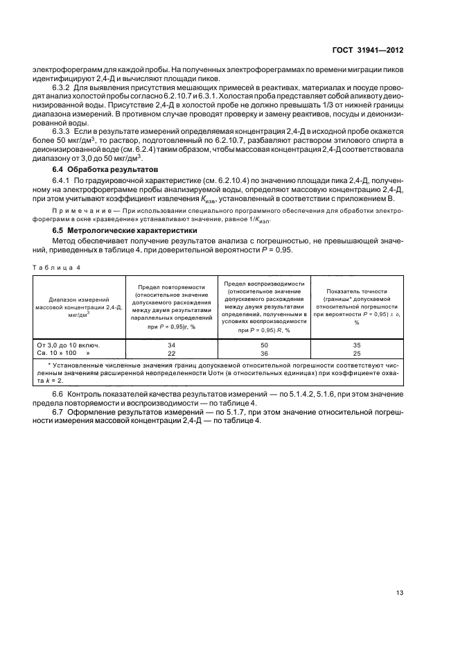 | Область и условия применения: | Настоящий стандарт распространяется на питьевую воду, природные (поверхностные и подземные) воды; в том числе источники питьевого водоснабжения, и устанавливает следующие методы определения массовой концентрации 2,4-дихлорфеноксиуксусной кислоты (далее - 2,4-Д):