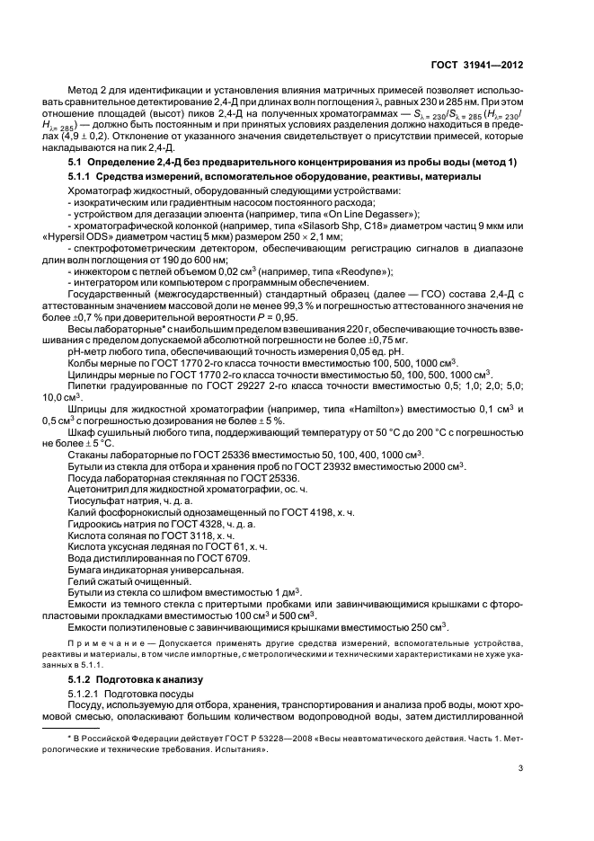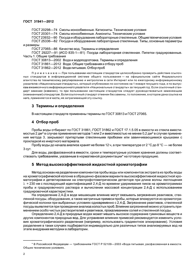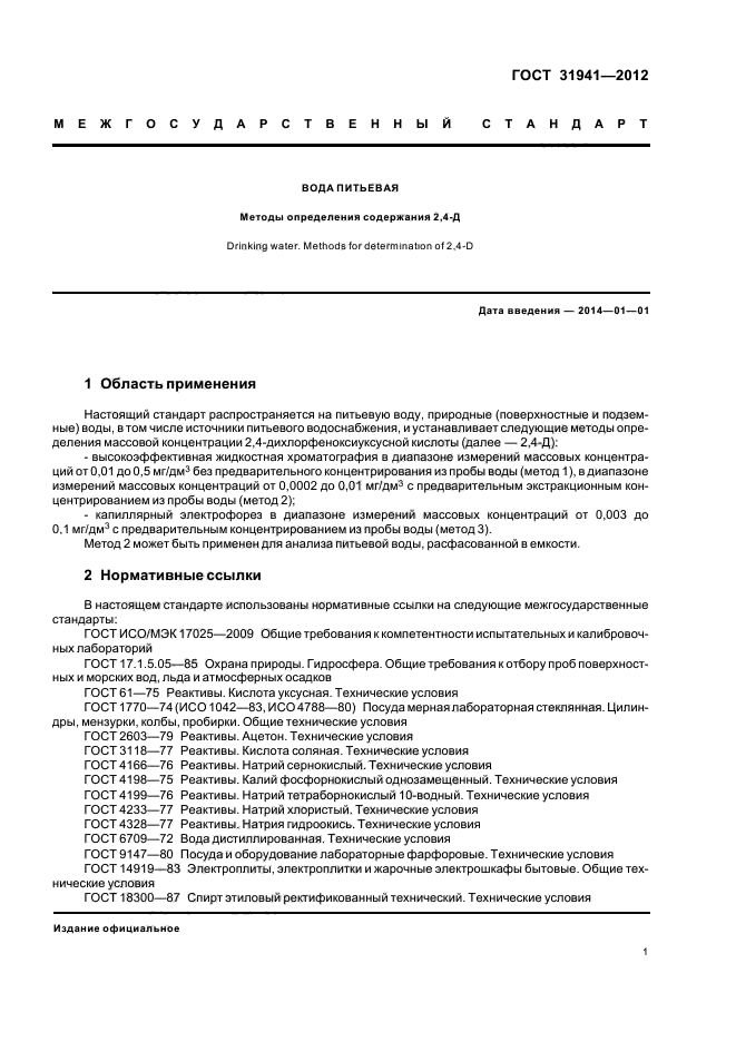 Настоящий стандарт распространяется на питьевую воду, природные (поверхностные и подземные) воды; в том числе источники питьевого водоснабжения, и устанавливает следующие методы определения массовой концентрации 2,4-дихлорфеноксиуксусной кислоты (далее - 2,4-Д):