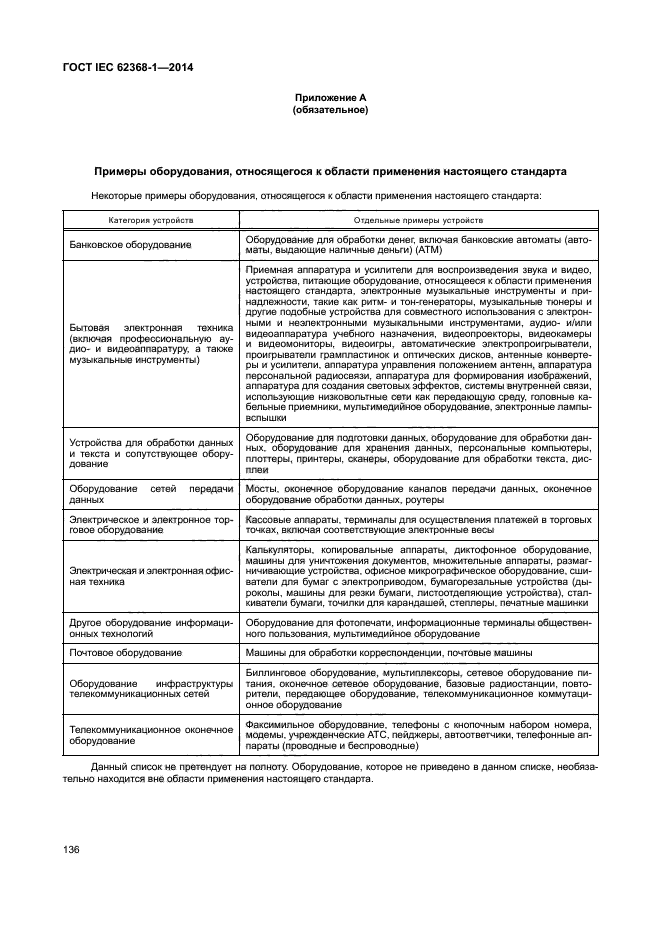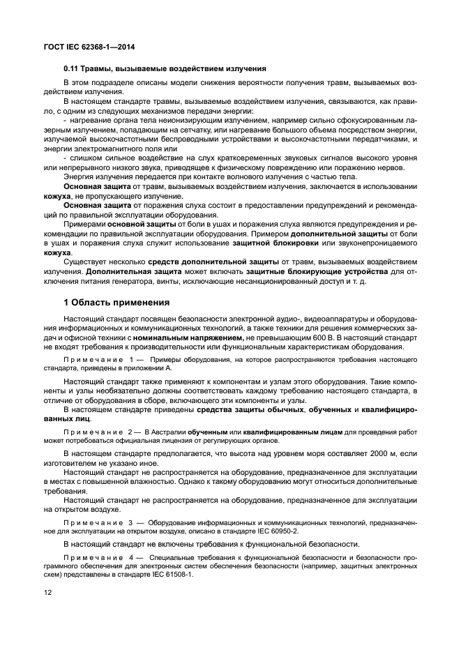 Данная часть стандарта IEC 62368 посвящена безопасности электронной аудио/видеоаппаратуры и оборудования информационных и коммуникационных технологий, а также техники для решения коммерческих задач и офисной техники с номинальным напряжением, не превышающим 600 В. В настоящий стандарт не входят требования к производительности или функциональным характеристикам оборудования.