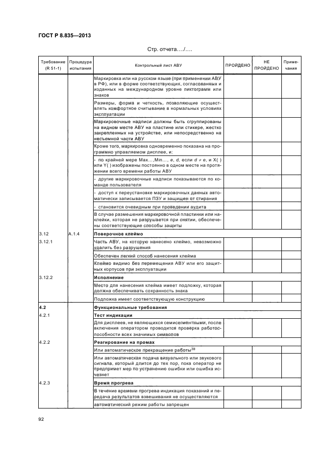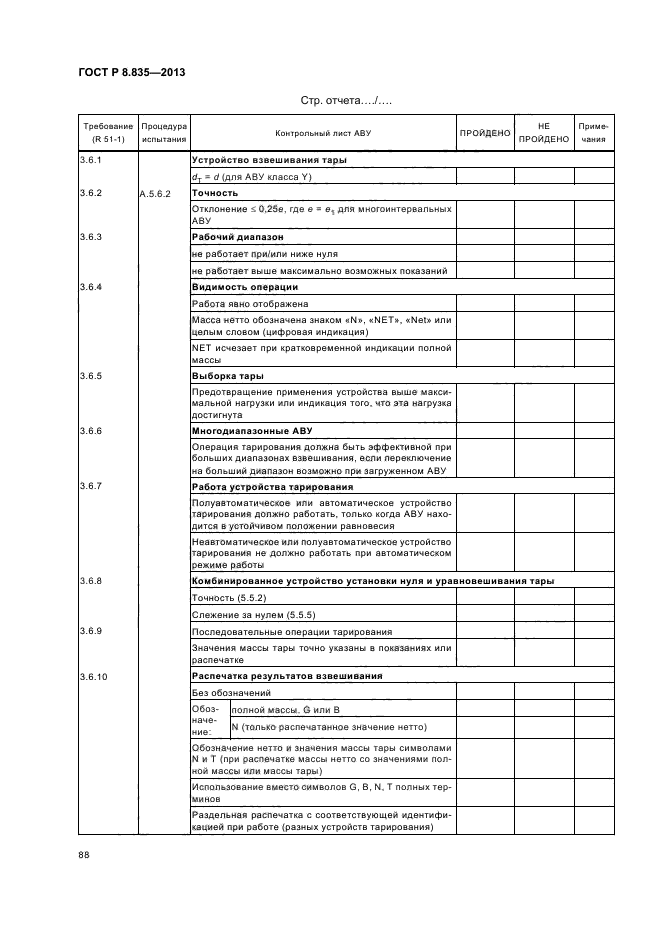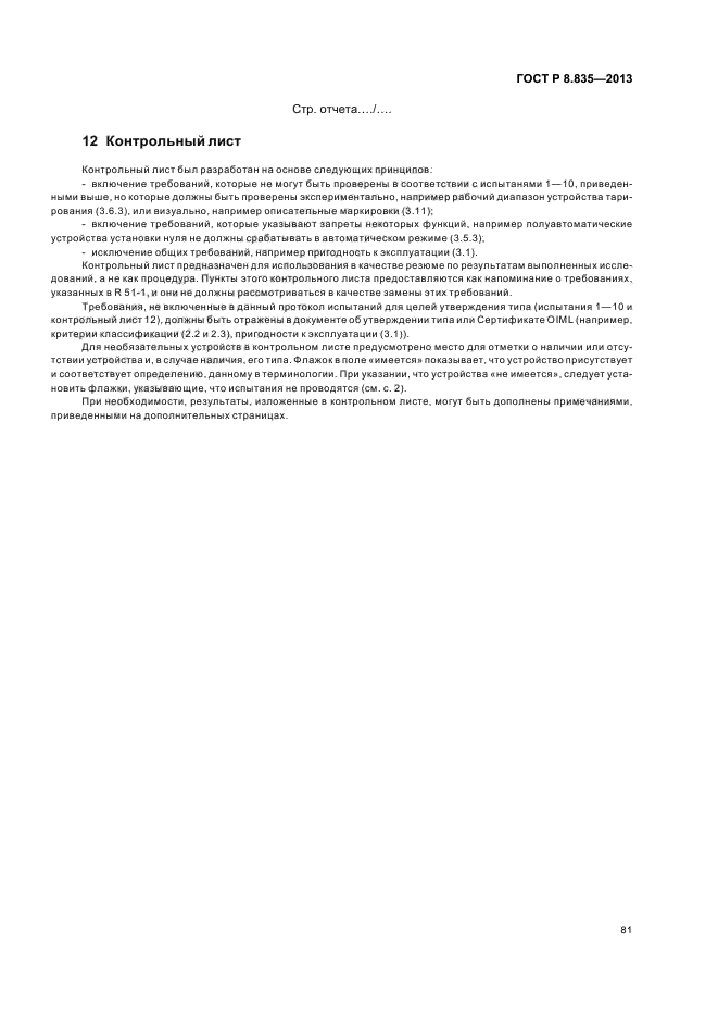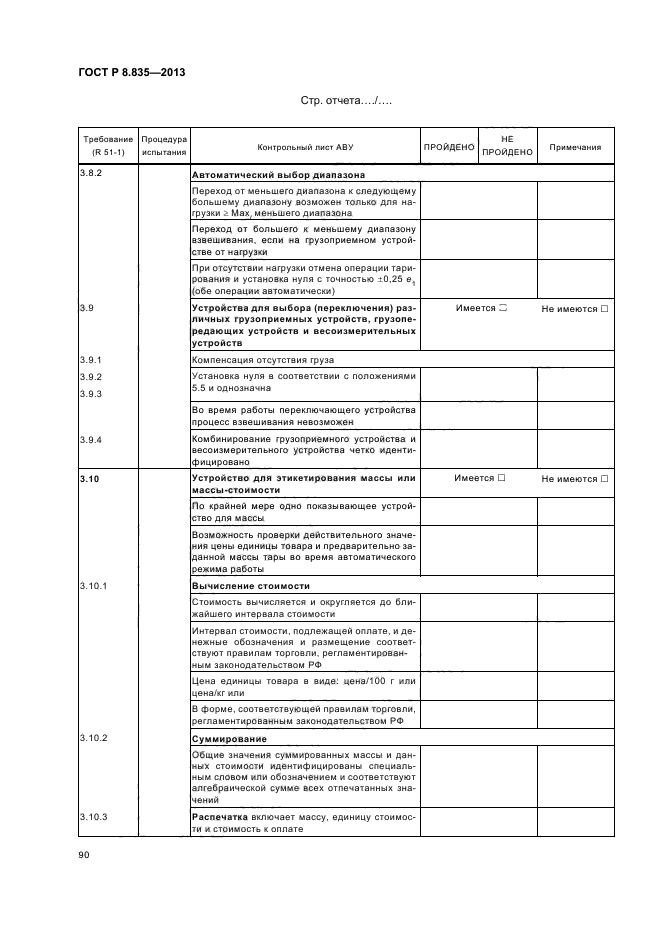 | Область и условия применения: | Настоящий стандарт распространяется на автоматические весоизмерительные устройства (АВУ) по OIML R 51-1:2006 «Автоматические весоизмерительные дозирующие устройства. Часть 1. Метрологические и технические требования. Испытания» (OIML R 51-1:2006 «Automatic catchweighing instruments. Part 1. Metrological and technical requirements - Tests») и устанавливает форму протокола испытаний АВУ для целей утверждения типа |