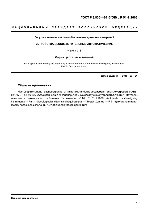 Настоящий стандарт распространяется на автоматические весоизмерительные устройства (АВУ) по OIML R 51-1:2006 «Автоматические весоизмерительные дозирующие устройства. Часть 1. Метрологические и технические требования. Испытания» (OIML R 51-1:2006 «Automatic catchweighing instruments. Part 1. Metrological and technical requirements - Tests») и устанавливает форму протокола испытаний АВУ для целей утверждения типа