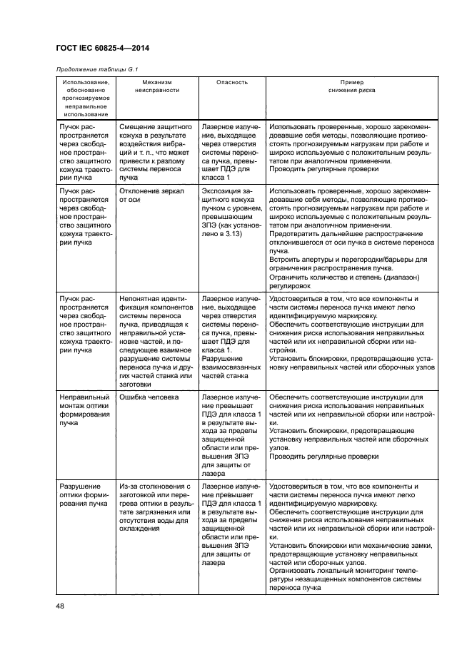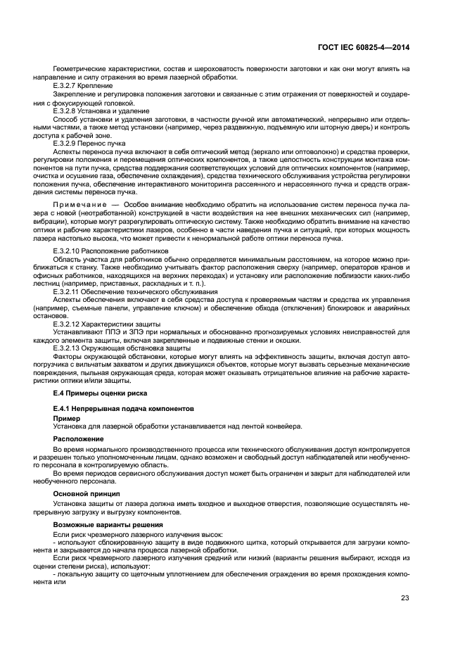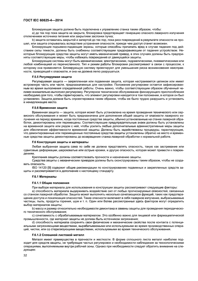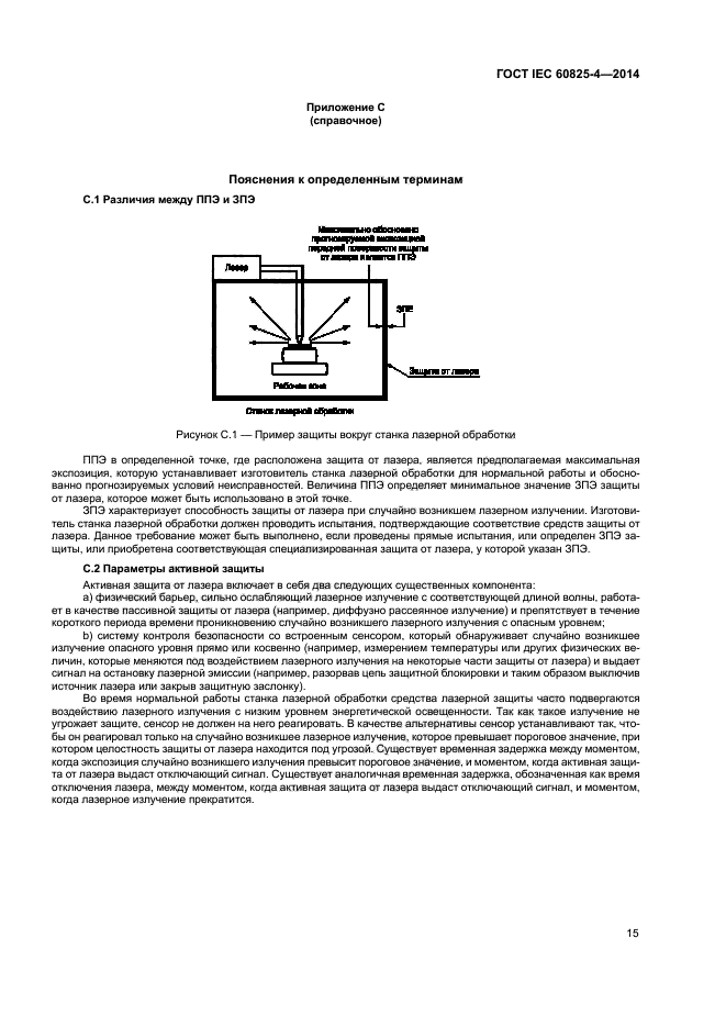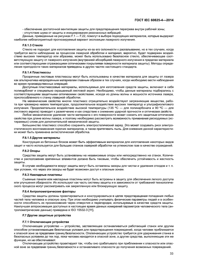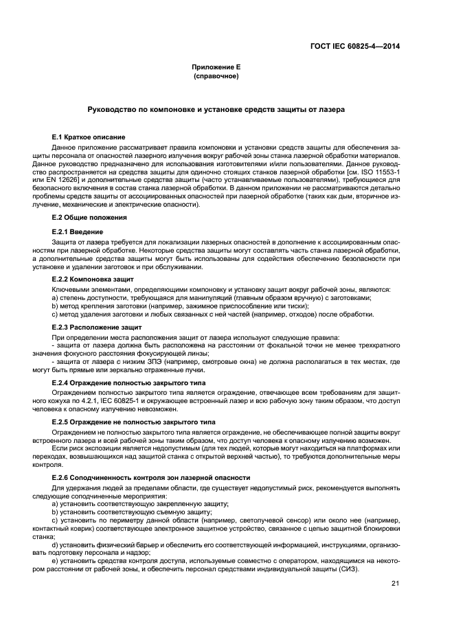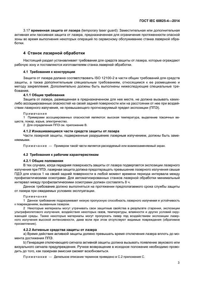 Требования настоящего стандарта применяют ко всем составным частям защиты, включая прозрачные (для видимого излучения) экраны и смотровые окна, панели, лазерные завесы и стенки. Требования к компонентам на пути пучка, блокираторам пучка и другим частям защитного кожуха лазерной аппаратуры, которые не ограждают рабочую зону, содержатся в IEC 60825-1.