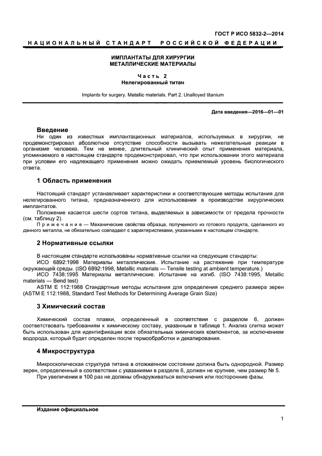 | Область и условия применения: | Настоящий стандарт устанавливает характеристики и соответствующие методы испытания для нелегированного титана, предназначенного для использования в производстве хирургических имплантатов |