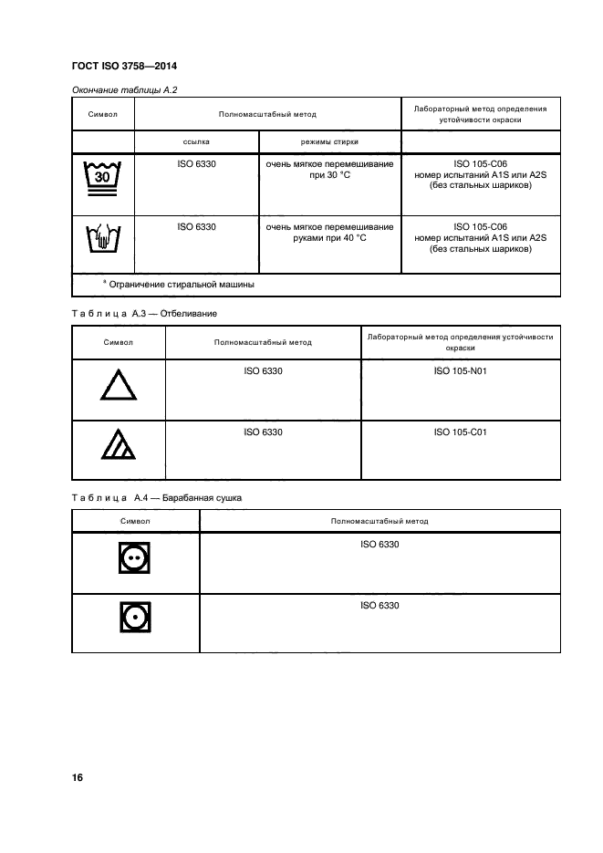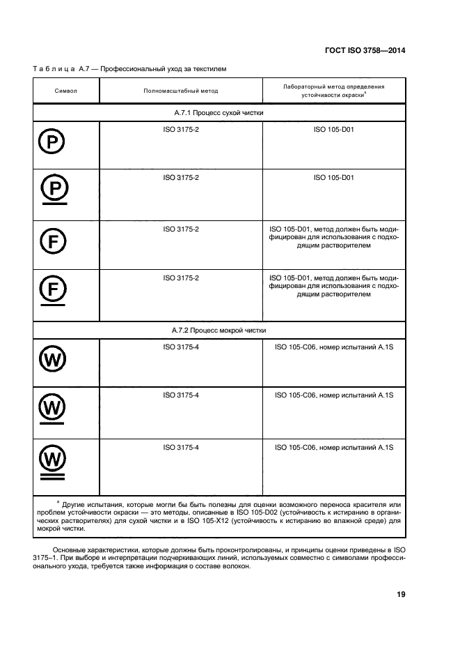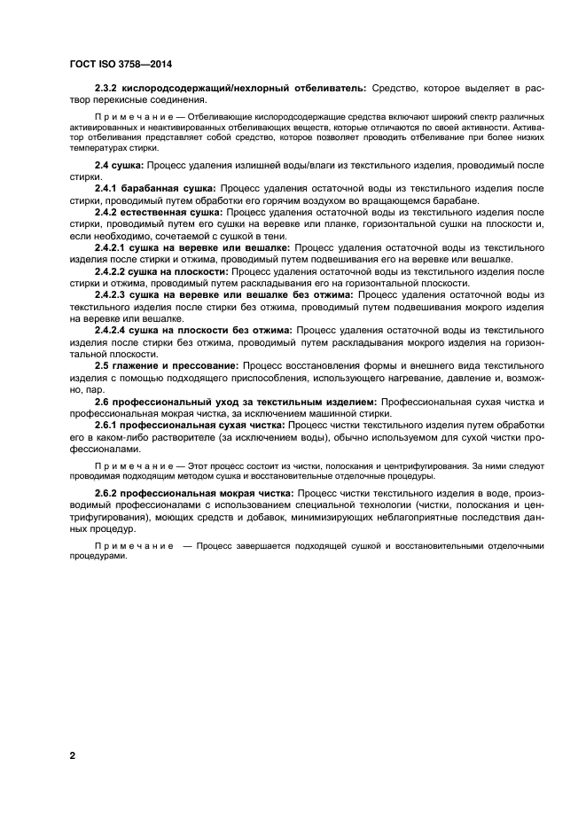 В настоящем стандарте рассмотрены такие виды домашней обработки как стирка, отбеливание, сушка и глажение. Включены также виды профессиональной обработки - сухая и мокрая чистка, исключено промышленное глажение. Однако принимается, что информация, сообщаемая четырьмя символами по уходу в домашних условиях, будет также полезна при проведении профессиональной чистки и глажения.