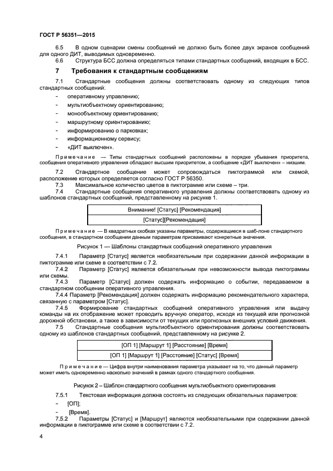 | Область и условия применения: | Настоящий стандарт распространяется на системы организации дорожного движения, обеспечивающие или поддерживающие возможность косвенного управления транспортными потоками посредством систем информирования, основанных на использовании динамических информационных табло.