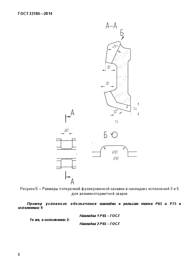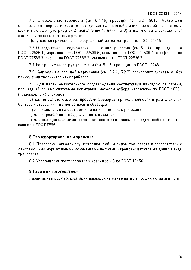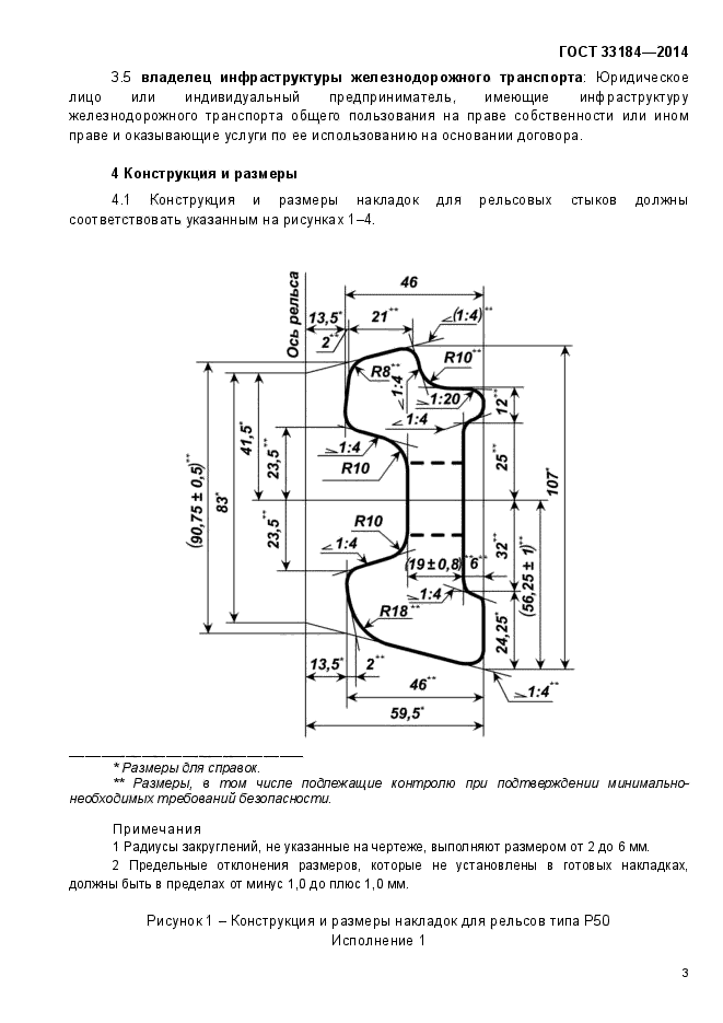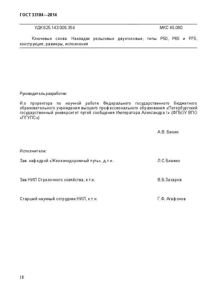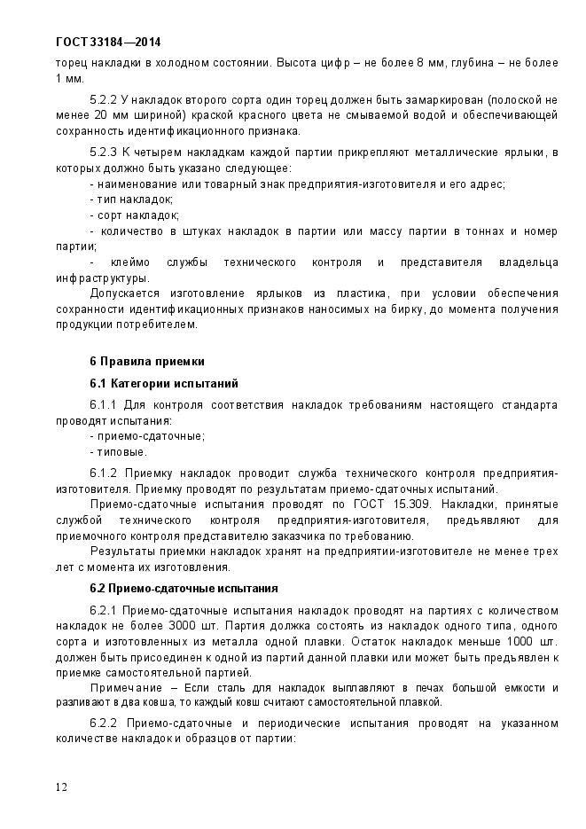 | Область и условия применения: | Настоящий стандарт распространяется на двухголовые накладки, применяемые для стыковых соединений рельсов железных дорог широкой колеи в токопроводящих и изолирующих стыках к железнодорожным рельсам типов Р50, Р65 и Р75 по ГОСТ 18267, в Российской Федерации действует ГОСТ Р 51685-2013 «Рельсы железнодорожные. Общие технические условия» или ГОСТ 24182 |