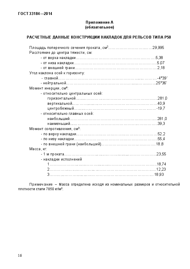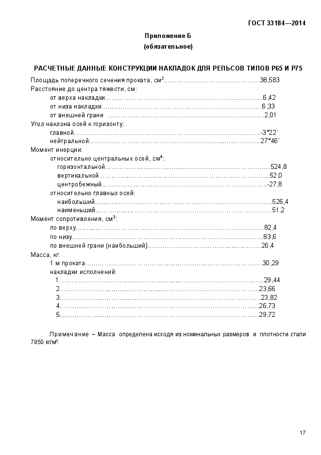 Настоящий стандарт распространяется на двухголовые накладки, применяемые для стыковых соединений рельсов железных дорог широкой колеи в токопроводящих и изолирующих стыках к железнодорожным рельсам типов Р50, Р65 и Р75 по ГОСТ 18267, в Российской Федерации действует ГОСТ Р 51685-2013 «Рельсы железнодорожные. Общие технические условия» или ГОСТ 24182