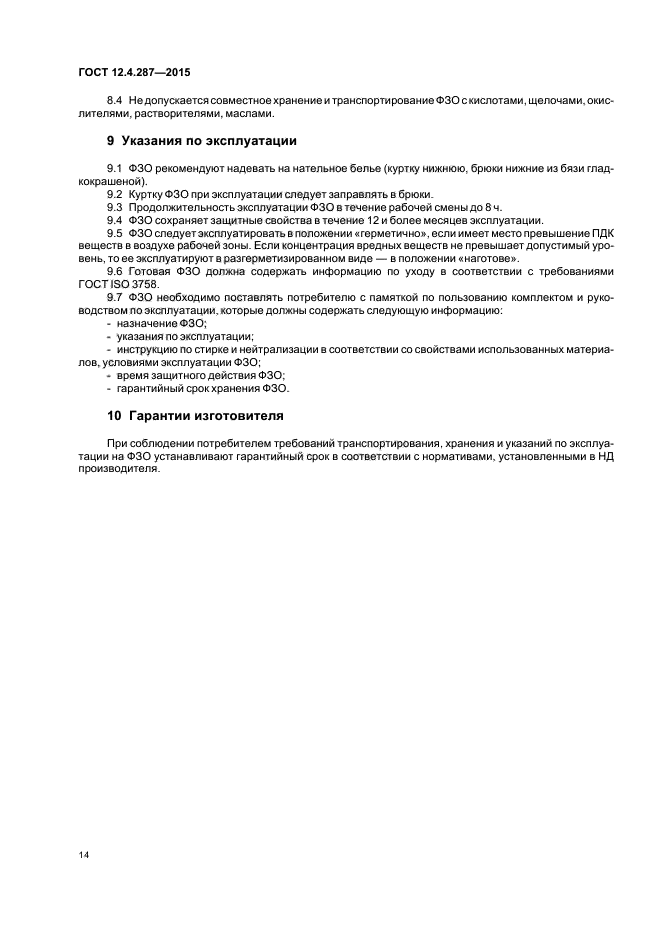 Настоящий стандарт распространяется на фильтрующую защитную одежду, изготовленную с использованием химзащитных фильтрующе-сорбирующих тканей на основе неуглеродных сорбентов и обеспечивающую защиту кожных покровов работника от воздействия паровой и газовой фазы токсичных химических веществ I, II, III классов опасности кожно-резорбтивного действия. Покровные слои фильтрующей защитной одежды защищают от открытого пламени или капель кислот с концентрацией до 50 %.