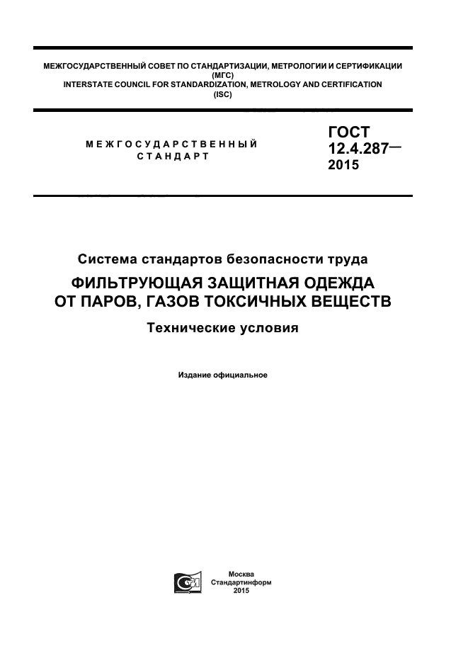 | Название рус.: | Система стандартов безопасности труда. Фильтрующая защитная одежда от паров, газов токсичных веществ. Технические условия |