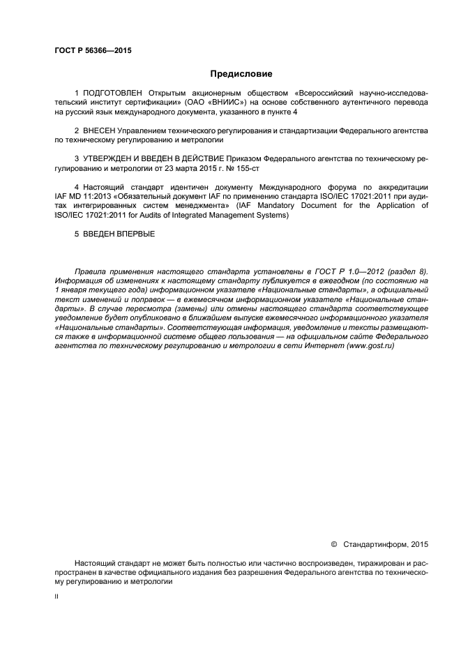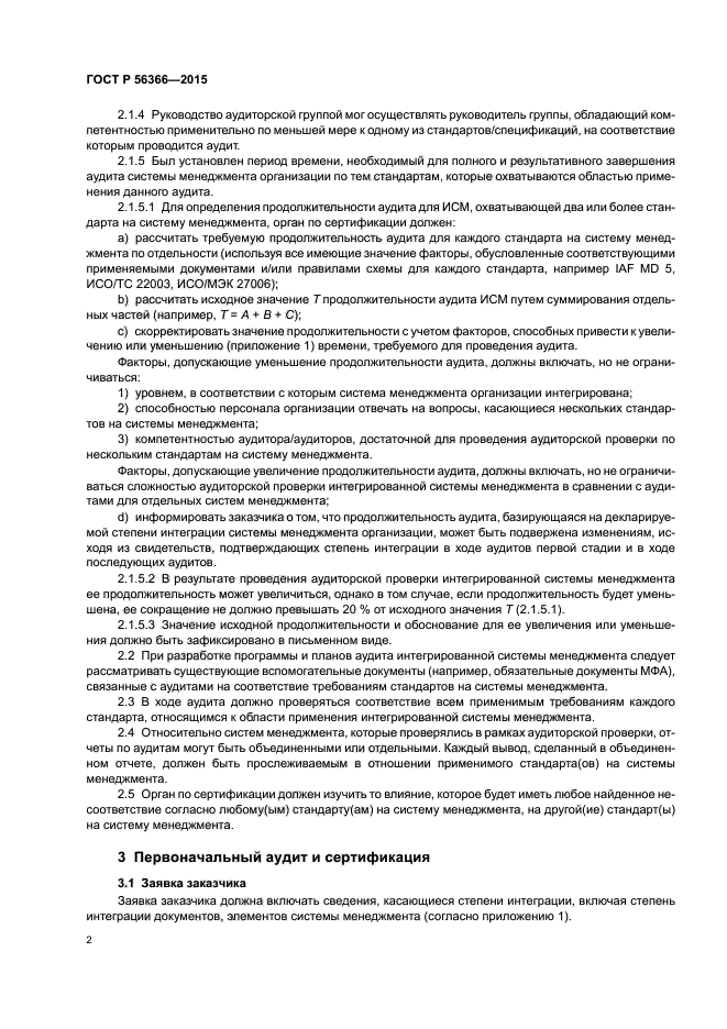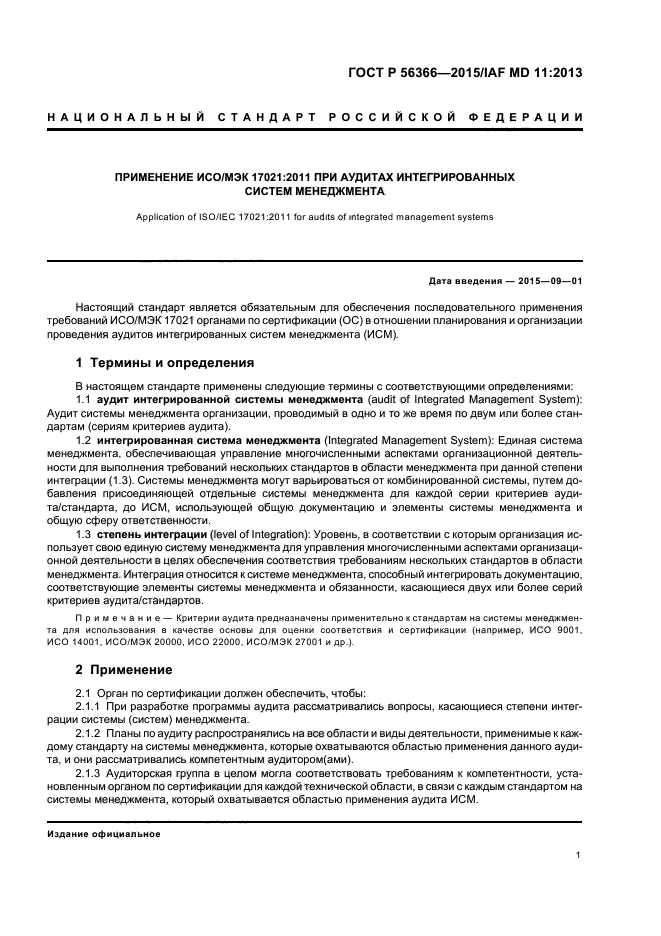 Настоящий стандарт является обязательным для обеспечения последовательного применения требований стандарта ISO/IEC 17021 органами по сертификации (ОС) в отношении планирования и организации проведения аудитов интегрированных систем менеджмента