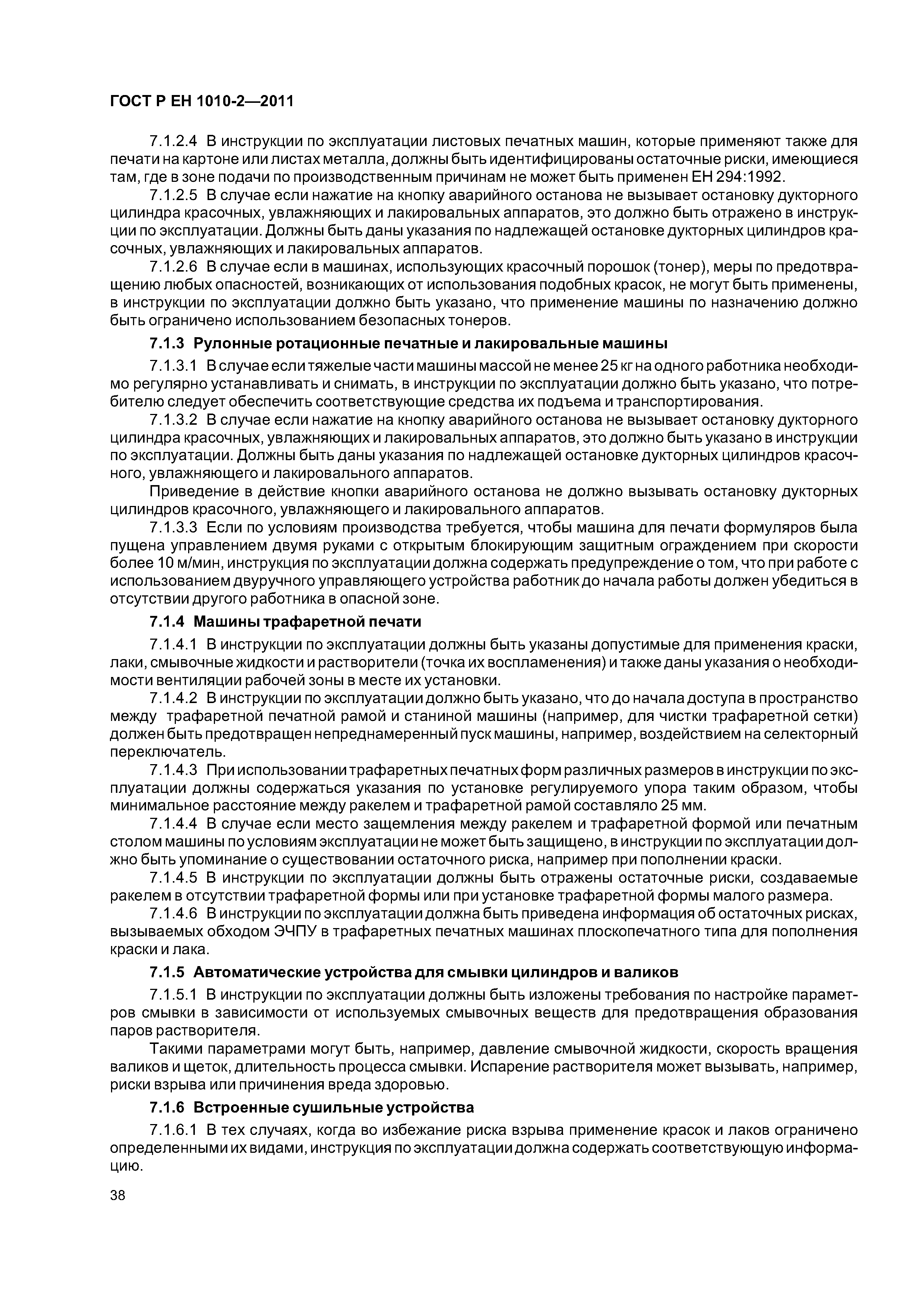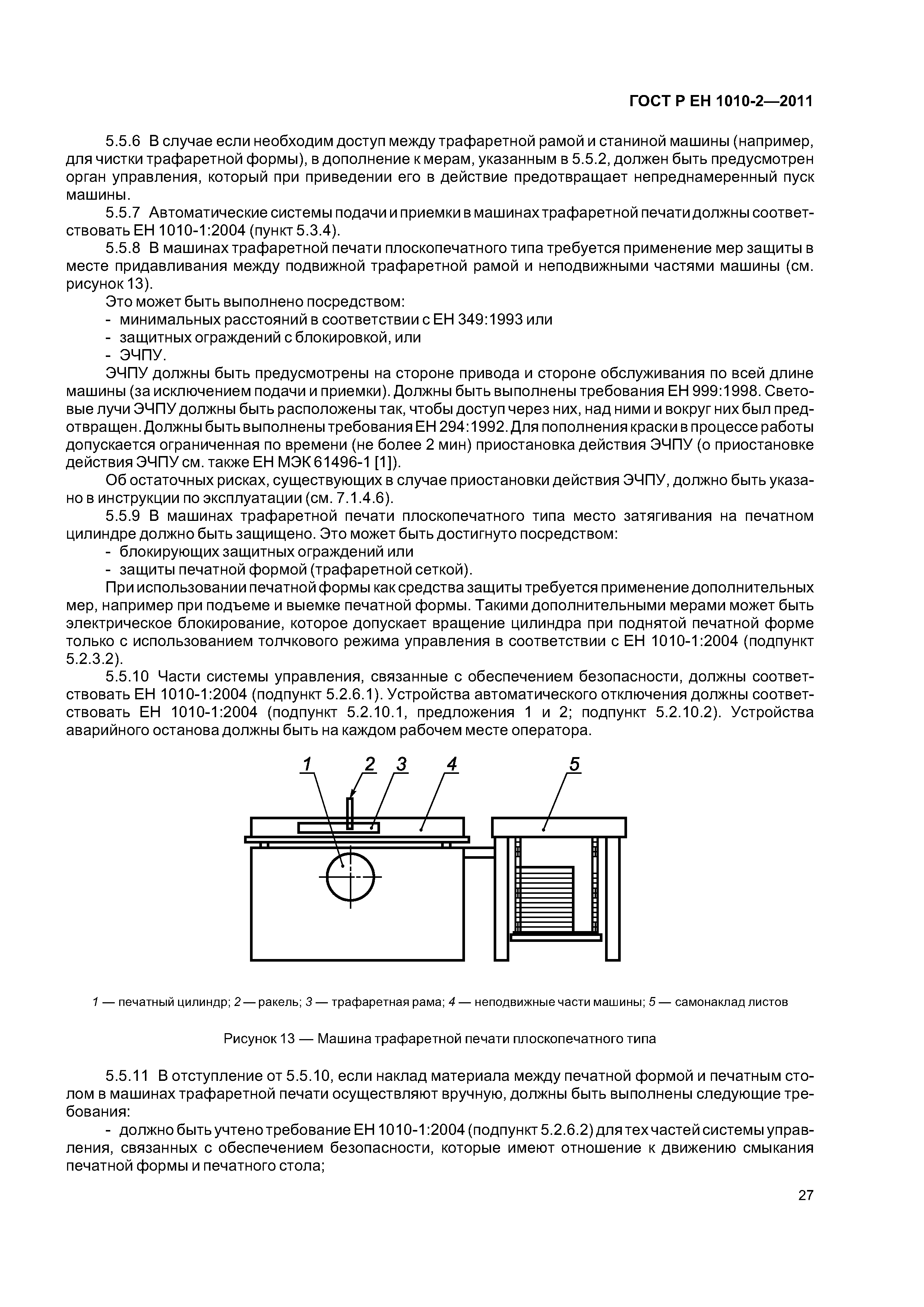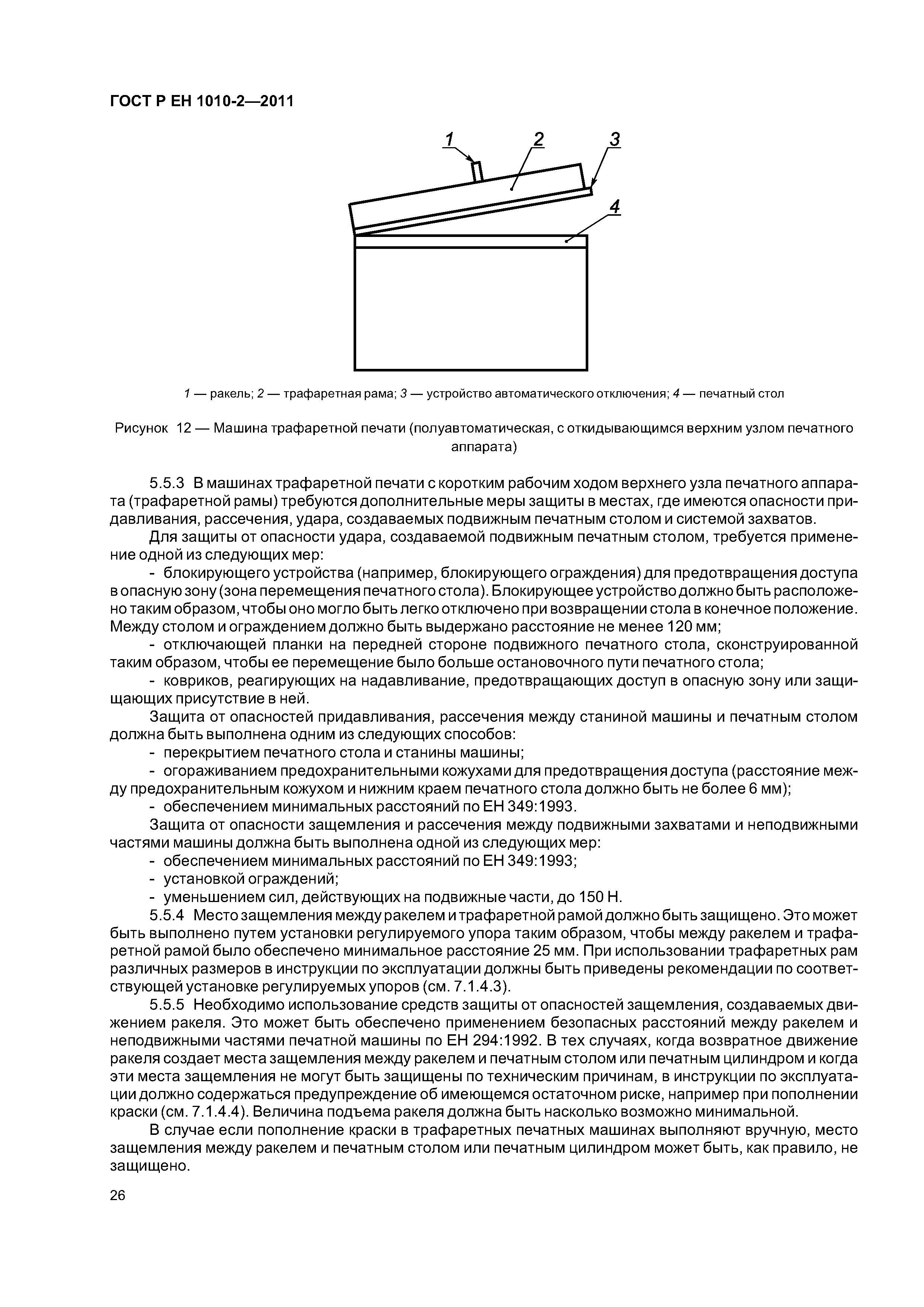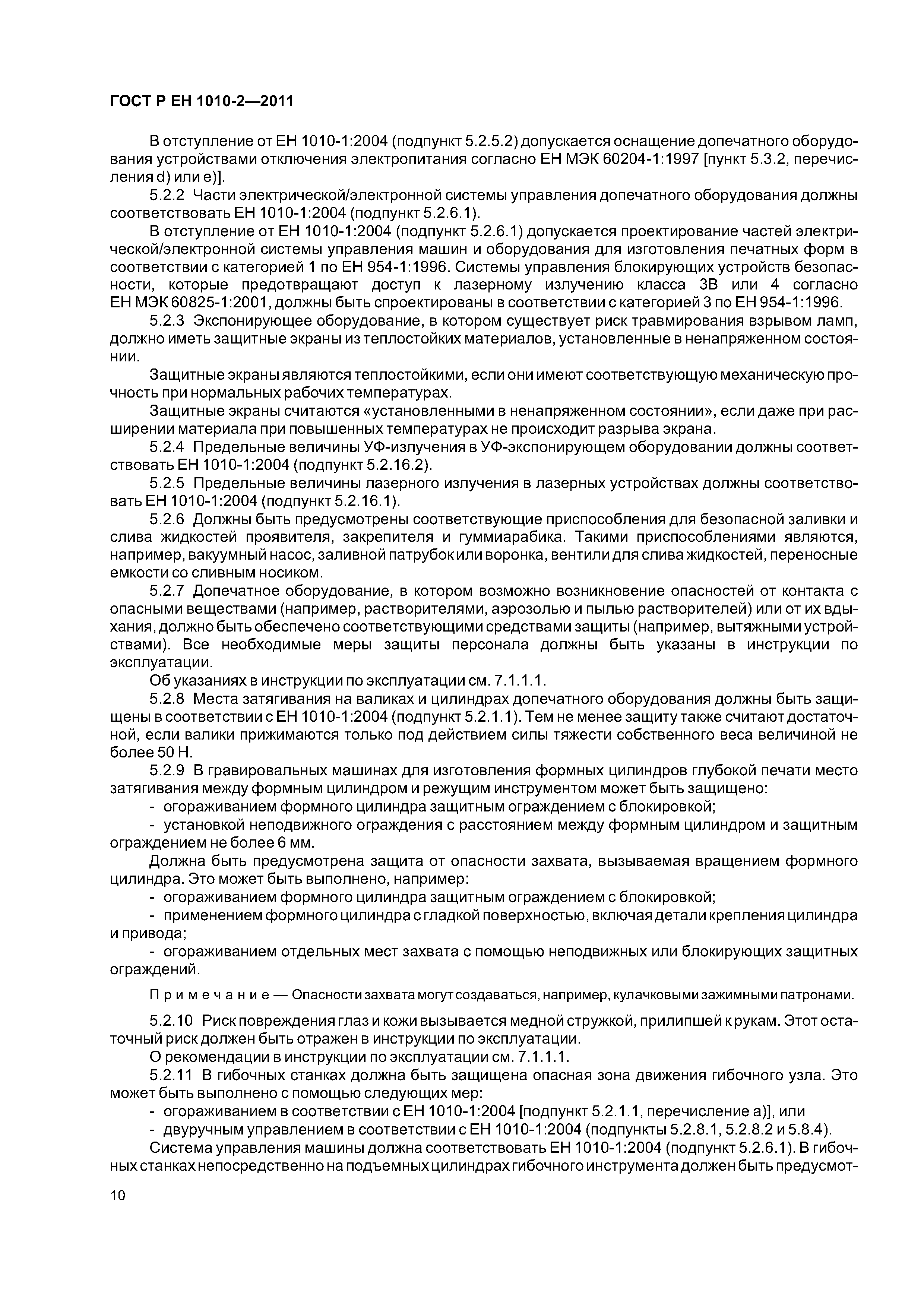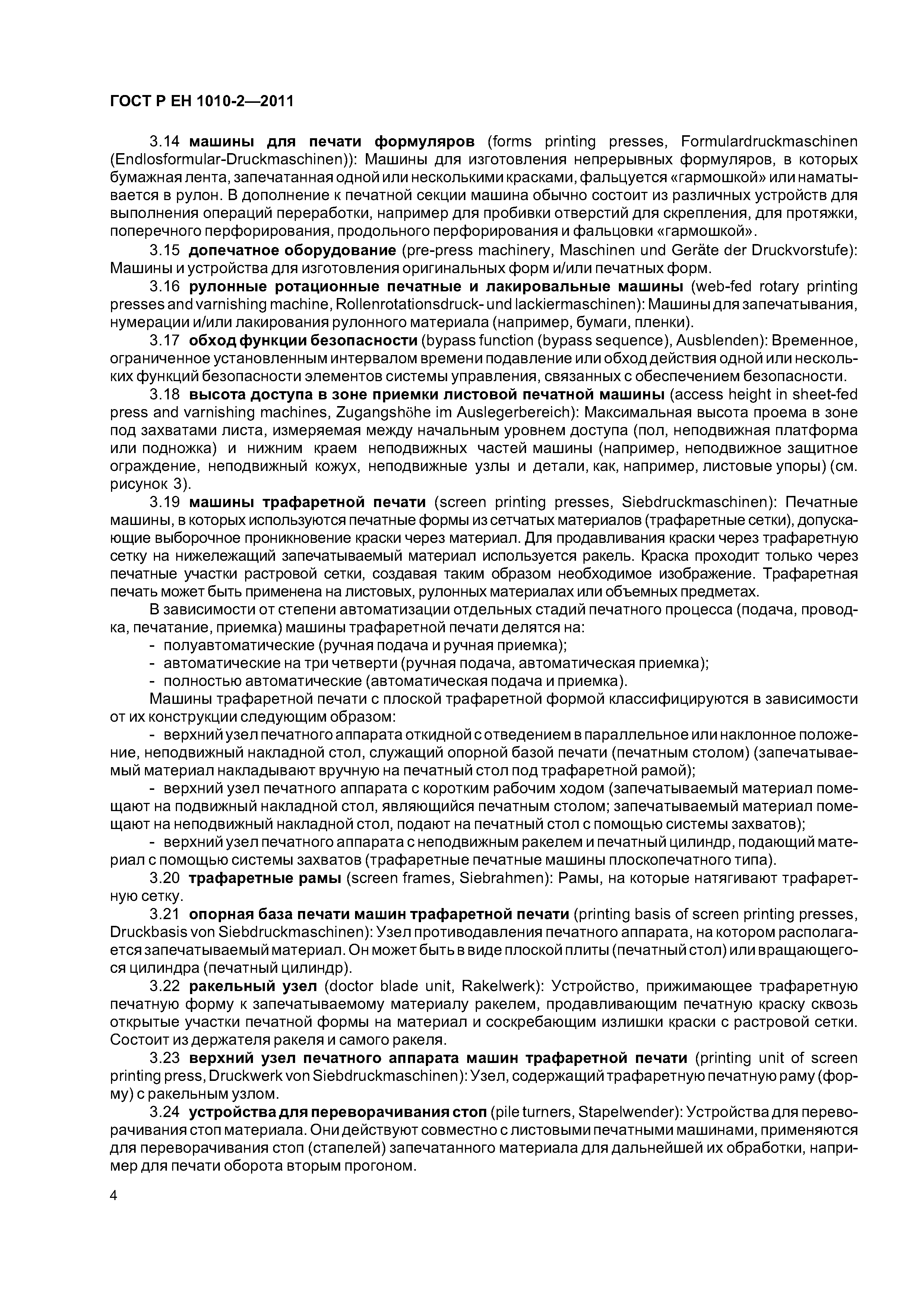 - допечатное оборудование (машины и оборудование для изготовления оригинальных и печатных форм), включая: - экспонирующее оборудование для изготовления фотоформ и печатных форм; - оборудование для проявления фотоформ и печатных форм; - устройства для смывки печатных форм; - гибочные станки для печатных форм; - станки для пробивки отверстий в печатных формах; - устройства для обрезки пленок и печатных форм; - оборудование для изготовления форм глубокой печати; - сканирующие устройства (устройства для считывания изображений); - печатные и лакировальные машины, включая: - пробопечатные станки; - листовые печатные и лакировальные машины, включая цифровые печатные; - рулонные ротационные печатные и лакировальные машины, включая цифровые печатные машины; - машины трафаретной печати; - вспомогательное оборудование, включая; - устройства для смывки цилиндров и валиков; - сушильные устройства; - порошковые противоотмарочные аппараты; - вспомогательные устройства к красочным и увлажняющим аппаратам; - автоматические устройства для закрепления печатной формы; - оборудование для смывки форм, валиков, ракельных ножей; - устройства для переворачивания стоп; - устройства для измерения и управления. Настоящий стандарт следует применять совместно с ГОСТ ЕН 1010-1. Настоящий стандарт не может быть применен к устройствам для чистки высокого давления и машинам трафаретной печати для текстильных материалов. Настоящий стандарт не может быть применен к машинам и оборудованию, которые изготовлены до даты введения настоящего стандарта в действие |
