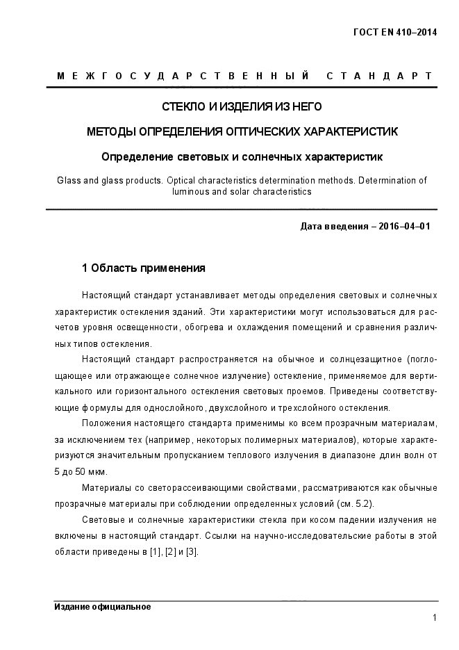 Настоящий стандарт устанавливает методы определения световых и солнечных характеристик остекления зданий. Эти характеристики могут использоваться для расчетов уровня освещенности, обогрева и охлаждения помещений и сравнения различных типов остекления.