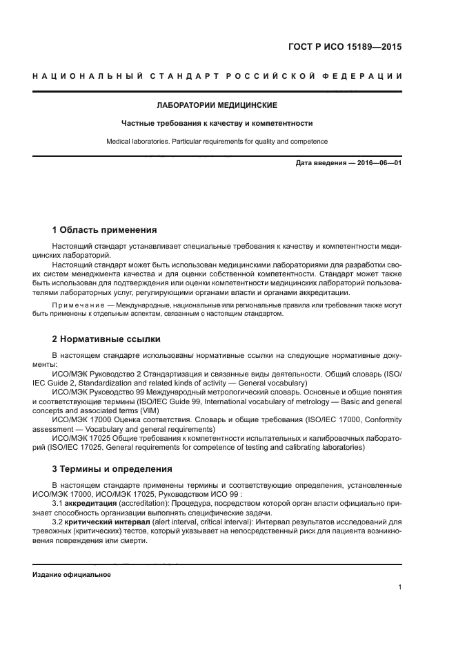 | Область и условия применения: | Настоящий стандарт устанавливает специальные требования к качеству и компетентности медицинских лабораторий.