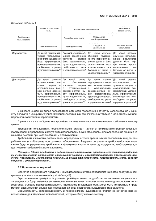a) модель качества при использовании, в состав которой входят пять характеристик, некоторые из которых, в свою очередь, подразделены на подхарактеристики. Эти характеристики касаются результата взаимодействия при использовании продукта в определенных условиях. Данная модель применима при использовании полных человеко-машинных систем, включая как вычислительные системы, так и программные продукты;