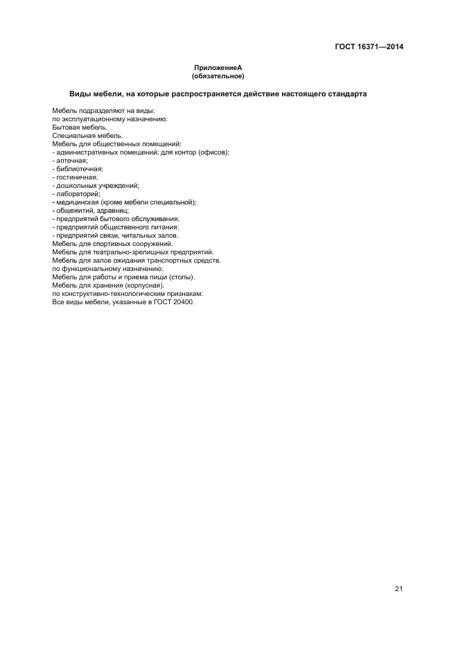 | Область и условия применения: | Настоящий стандарт распространяется на бытовую мебель и мебель для общественных помещений, выпускаемую предприятиями (организациями) любых форм собственности, а также индивидуальными изготовителями.