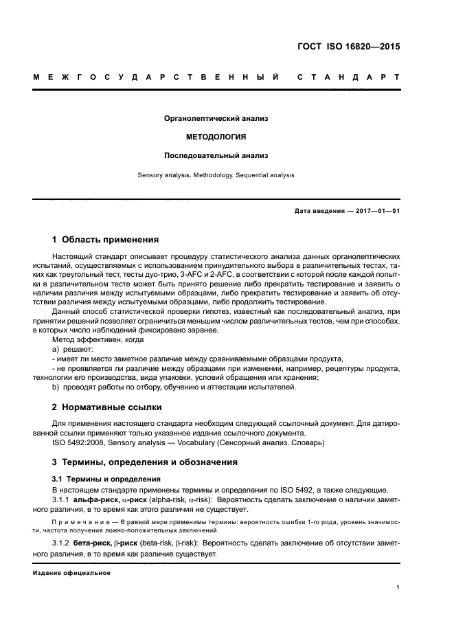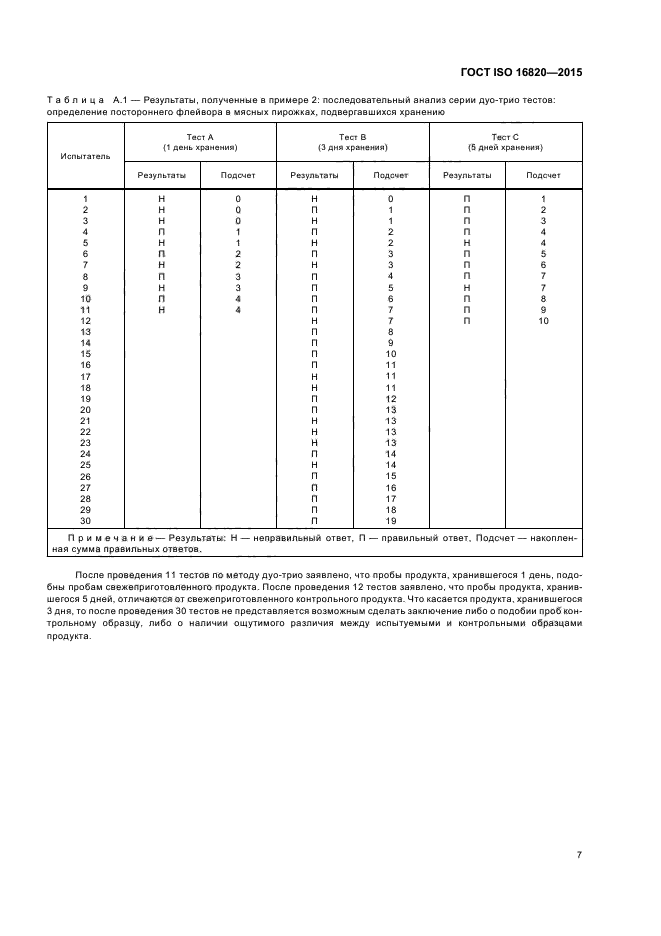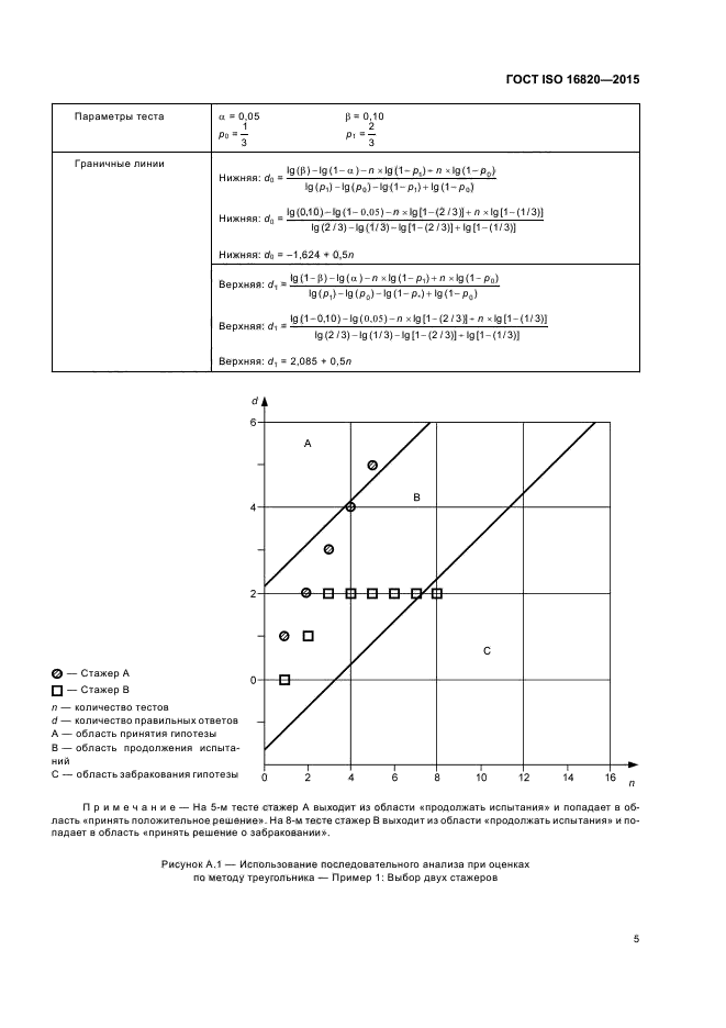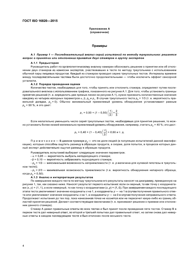 Настоящий стандарт описывает процедуру статистического анализа данных органолептических испытаний, осуществляемых с использованием принудительного выбора в различительных тестах, таких как треугольный тест, тесты дуо-трио, 3-AFC и 2-AFC, в соответствии с которой после каждой попытки в различительном тесте может быть принято решение либо прекратить тестирование и заявить о наличии различия между испытуемыми образцами, либо прекратить тестирование и заявить об отсутствии различия между испытуемыми образцами, либо продолжить тестирование