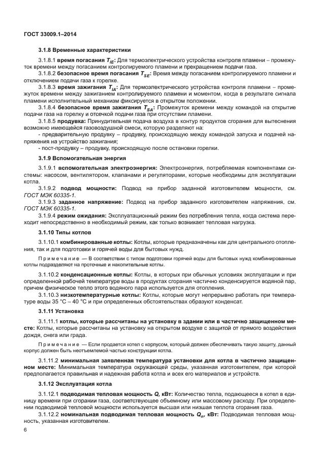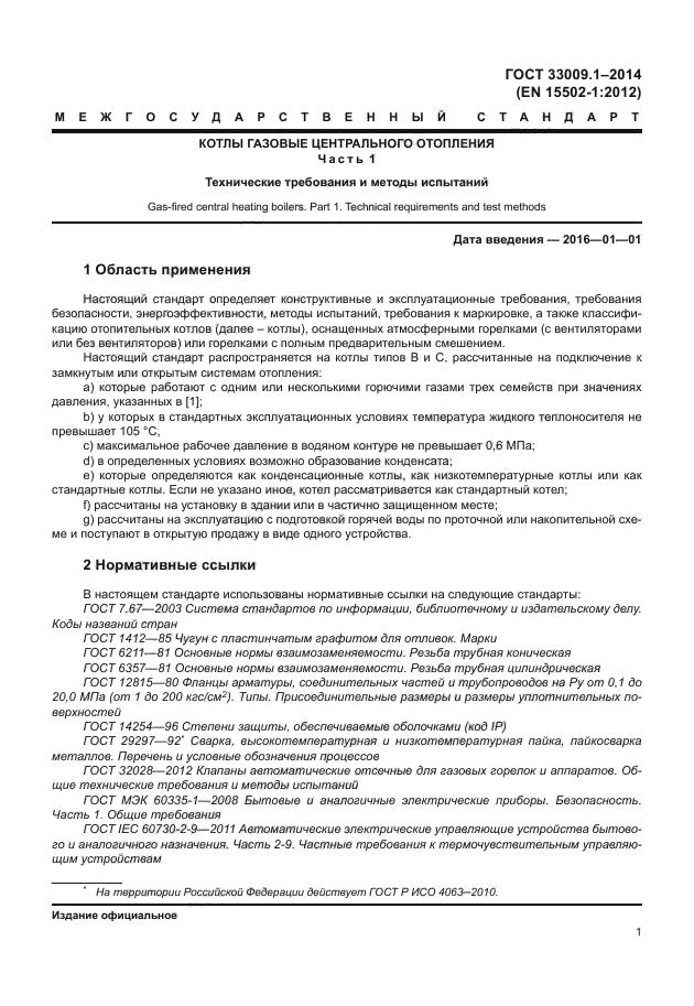 | Область и условия применения: | Настоящий стандарт определяет конструктивные и эксплуатационные требования, требования безопасности, энергоэффективности, методы испытаний, требования к маркировке, а также классификацию отопительных котлов (далее - котлы), оснащенных атмосферными горелками (с вентиляторами или без вентиляторов) или горелками с полным предварительным смешением.