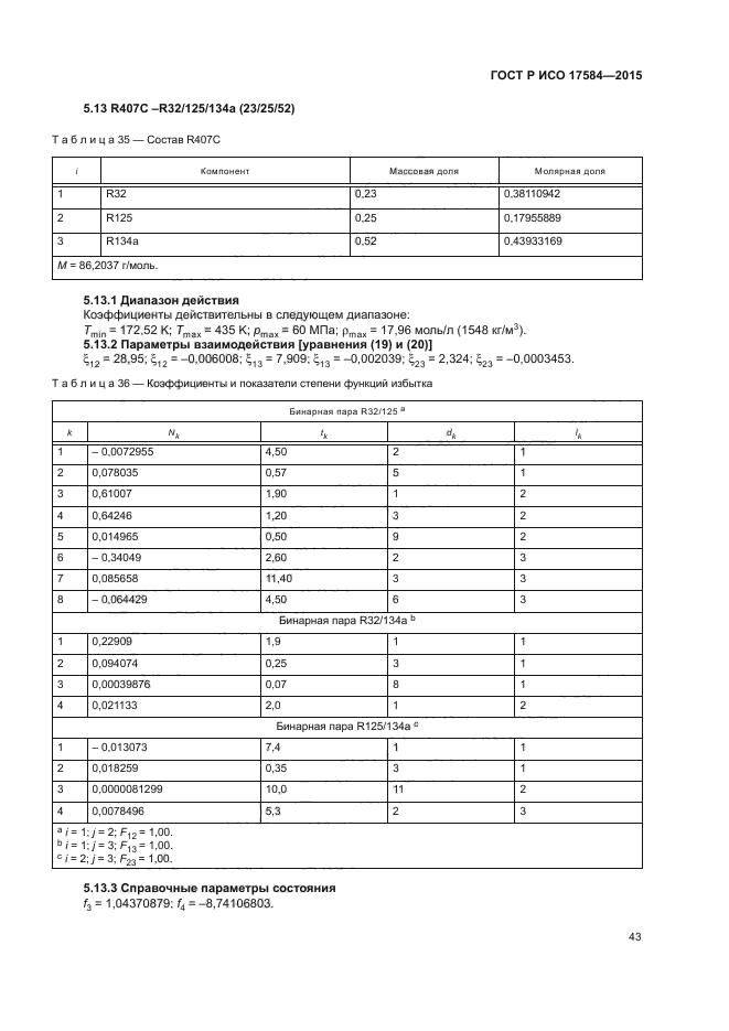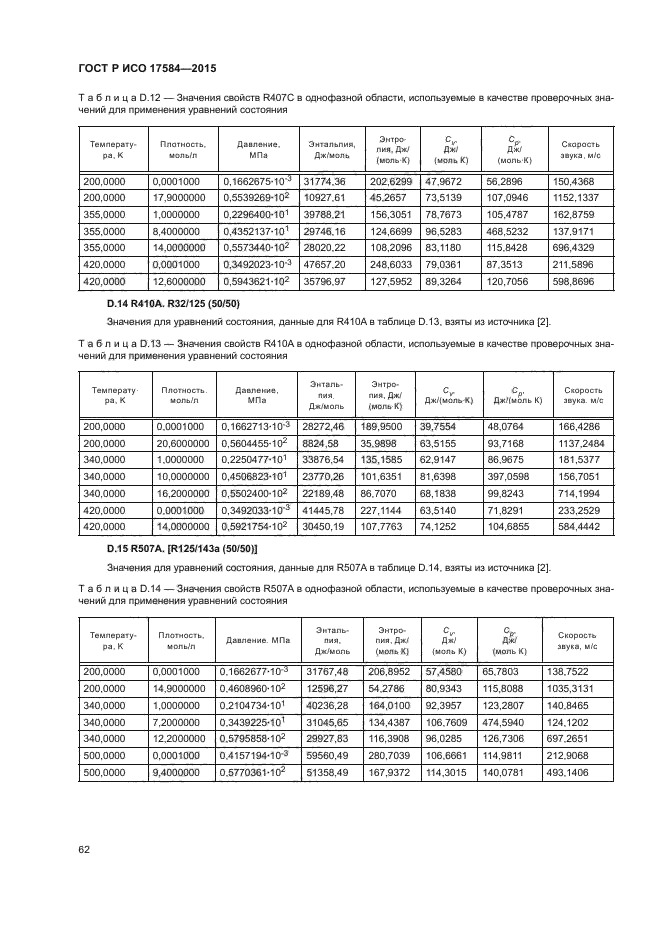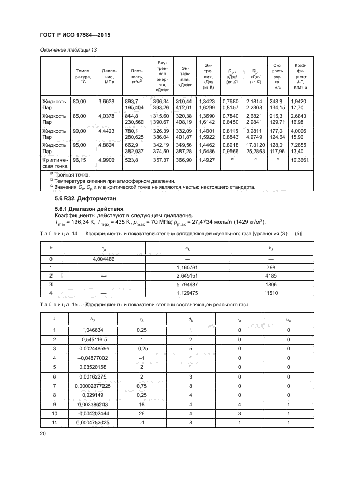 Настоящий стандарт применим к хладагентам R12, R22, R32, R123, R125, R134a, R143a, R152a, R717 (аммиак) и R744 (диоксид углерода) и к смесям хладагентов R404A, R407С, R410A и R507A. Включены следующие свойства: плотность, давление, внутренняя энергия, энтальпия, энтропия, теплоемкость при постоянном давлении, теплоемкость при постоянном объеме, скорость звука и коэффициент Джоуля-Томсона, как в однофазном состоянии, так и на границе насыщения жидкости/пара. Числовое обозначение хладагентов - в соответствии с ИСО 817