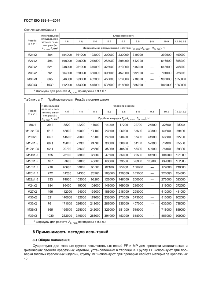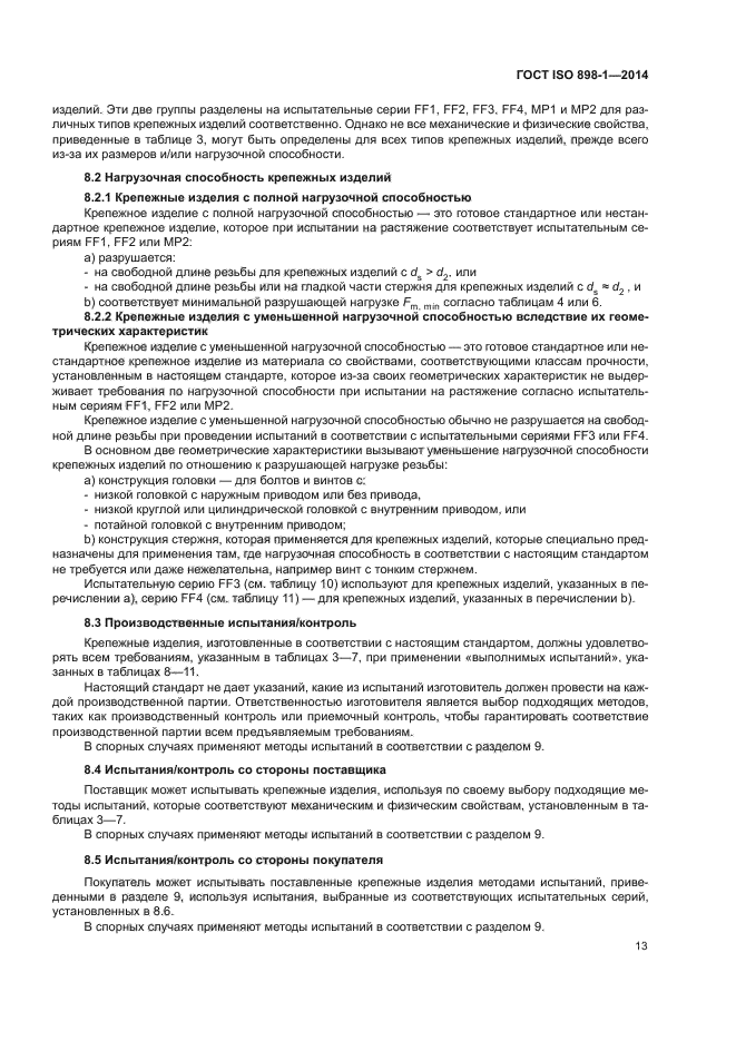 Некоторые болты и винты могут не соответствовать требованиям настоящего стандарта по растяжению или кручению вследствие уменьшенной площади среза в головке по отношению к расчетному сечению резьбы. К ним относят болты и винты, имеющие низкую или потайную головку (см. 8.2) Стандарт распространяется на болты, винты и шпильки: - из углеродистых или легированных сталей; - с треугольной метрической резьбой в соответствии с ISO 68-1; - с крупным шагом резьбы от M1,6 до М39 и с мелким шагом резьбы от М8х1 до М39хЗ; - с сочетаниями диаметр/шаг в соответствии с ISO 261 и ISO 262; - с допусками резьбы в соответствии с ISO 965-1, ISO 965-2 и ISO 965-4. Стандарт не распространяется на установочные винты и аналогичные резьбовые крепежные изделия, не подвергаемые растягивающим напряжениям (см. ISO 898-5). Стандарт не устанавливает требования к следующим свойствам: - свариваемость; - коррозионная стойкость; - прочность на срез; - отношение крутящего момента к усилию предварительной затяжки (метод испытания см. ISO 16047); - усталостная прочность |