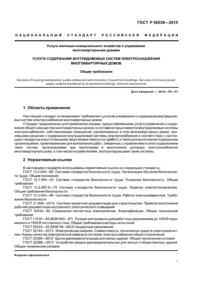 | Область и условия применения: | Настоящий стандарт устанавливает требования к услугам управления и содержания внутридомовых систем электроснабжения многоквартирных домов.