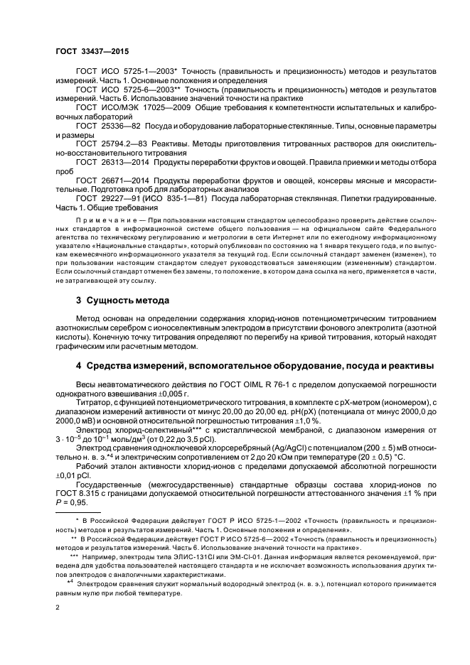| Область и условия применения: | Настоящий стандарт распространяется на фруктовые и овощные соки, нектары и сокосодержащие напитки, фруктовые и овощные концентрированные соки, пюре и концентрированные пюре, морсы и концентрированные морсы (далее-соковая продукция) и устанавливает потенциометрический метод определения (измерения) массовой концентрации хлорид-ионов.