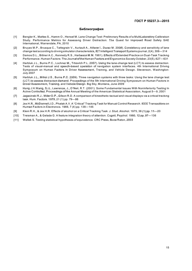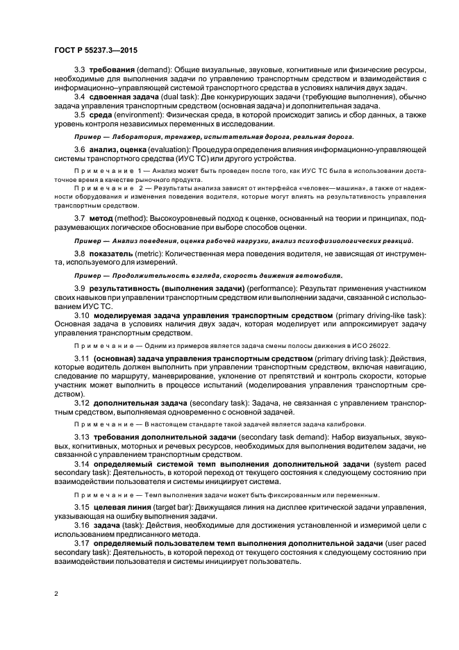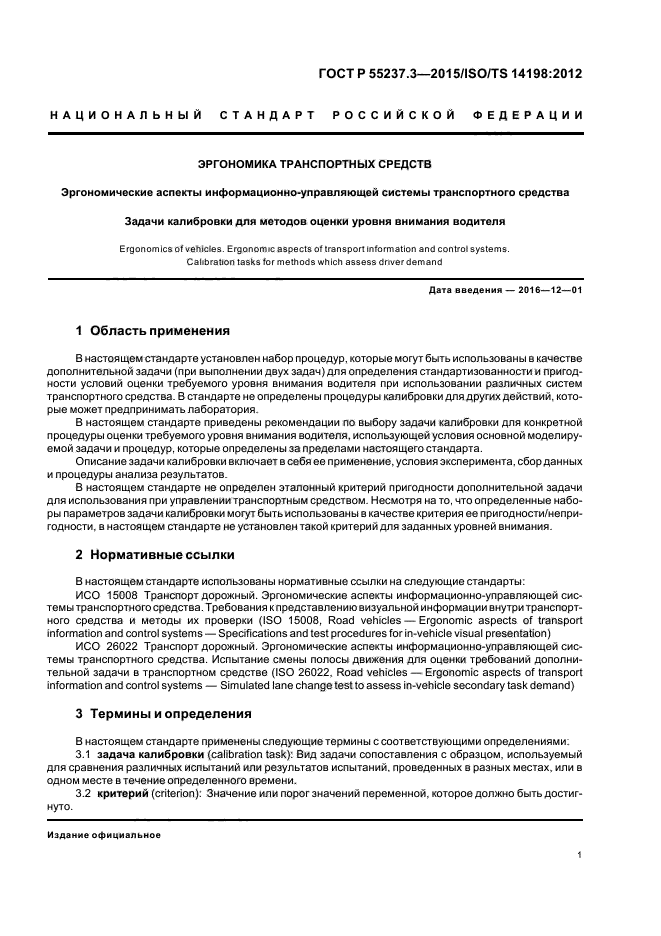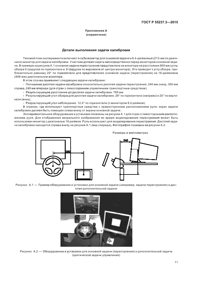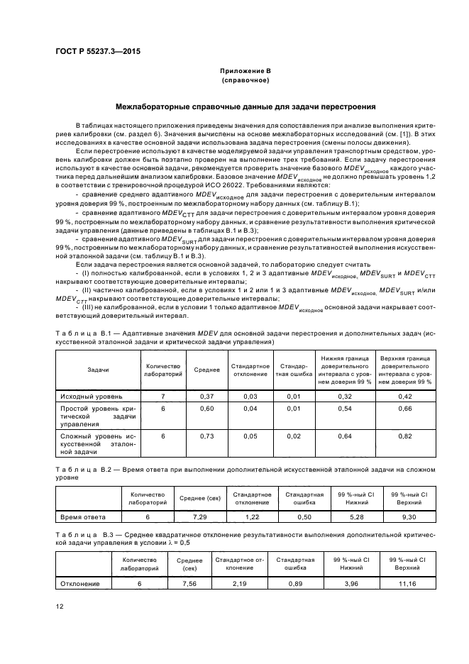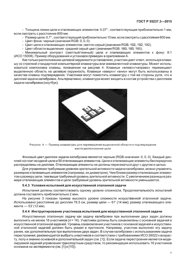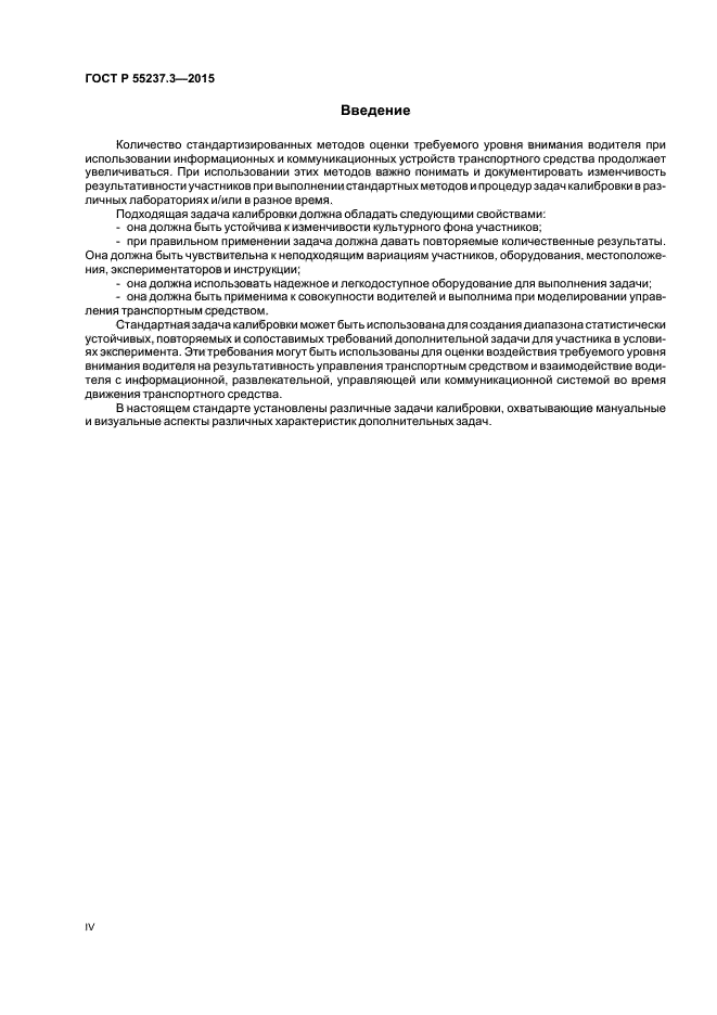 В настоящем стандарте установлен набор процедур, которые могут быть использованы в качестве дополнительной задачи (при выполнении двух задач) для определения стандартизованности и пригодности условий оценки требуемого уровня внимания водителя при использовании различных систем транспортного средства. В стандарте не определены процедуры калибровки для других действий, которые может предпринимать лаборатория.