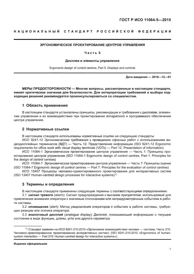 | Область и условия применения: | В настоящем стандарте установлены принципы, рекомендации и требования к дисплеям, элементам управления и их взаимодействию при проектировании аппаратного и программного обеспечения центра управления |