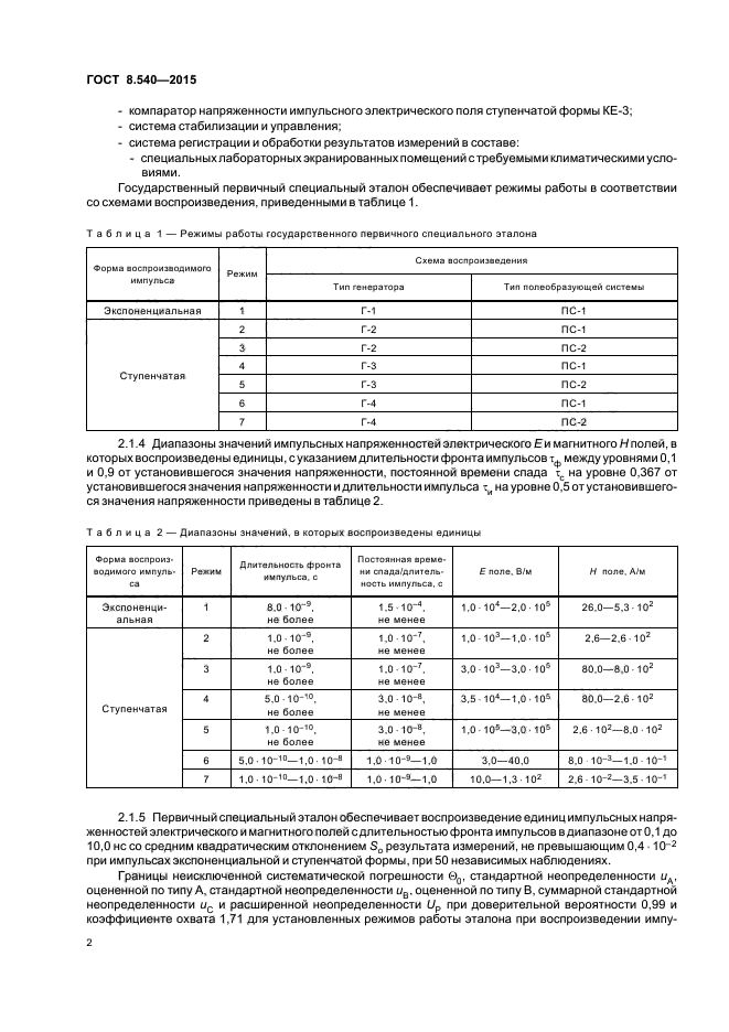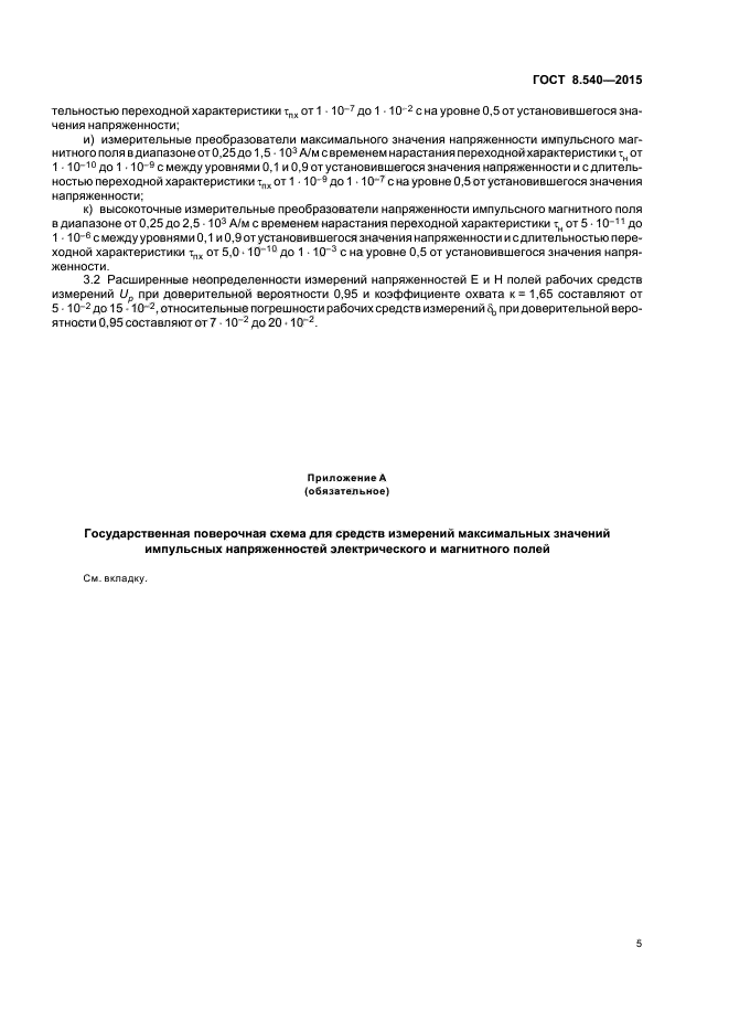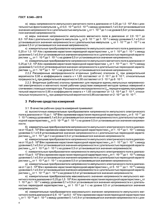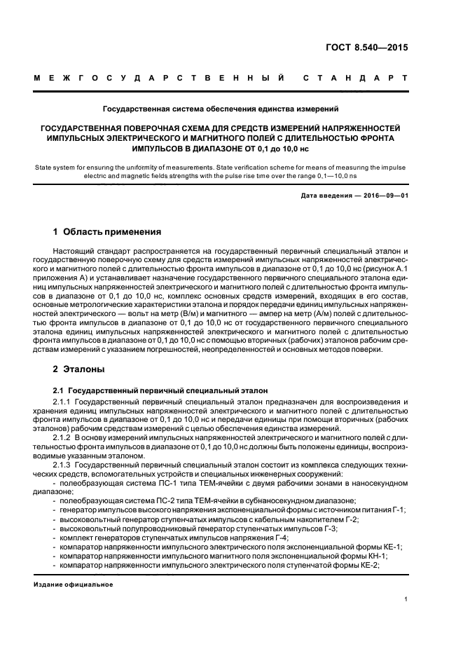 Настоящий стандарт распространяется на государственный первичный специальный эталон и государственную поверочную схему для средств измерений напряженностей импульсных электрического и магнитного полей с длительностью фронта импульсов в диапазоне от 0,1 до 10,0 нс (рисунок А.1 приложения А), и устанавливает назначение государственного первичного специального эталона единиц напряженностей импульсных электрического и магнитного полей с длительностью фронта импульсов в диапазоне от 0,1 до 10,0 нс, комплекс основных средств измерений, входящих в его состав, основные метрологические характеристики эталона и порядок передачи единиц напряженностей импульсных электрического - вольт на метр (В/м) и магнитного - ампер на метр (А/м) полей с длительностью фронта импульсов в диапазоне от 0,1 до 10,0 нс от государственного первичного специального эталона единиц напряженностей импульсных электрического и магнитного полей с длительностью фронта импульсов в диапазоне от 0,1 до 10,0 нс с помощью вторичных (рабочих) эталонов рабочим средствам измерений с указанием погрешностей, неопределенностей и основных методов поверки