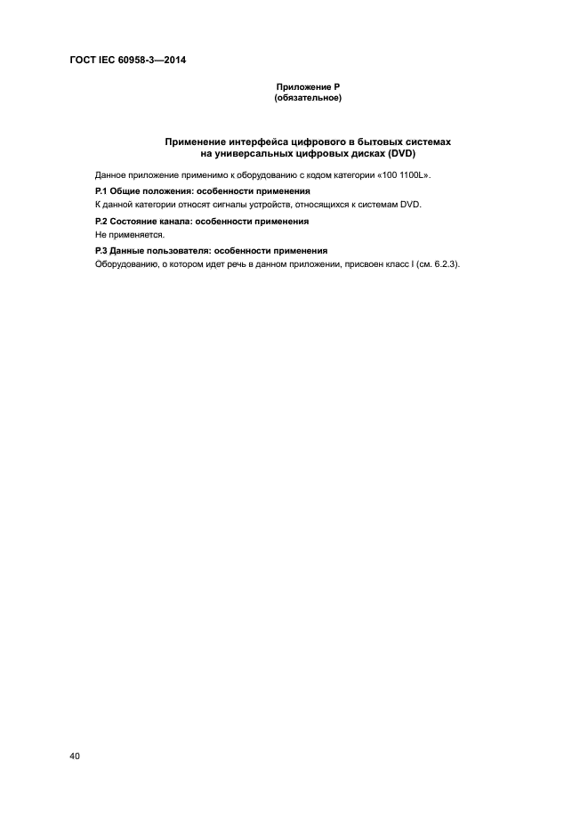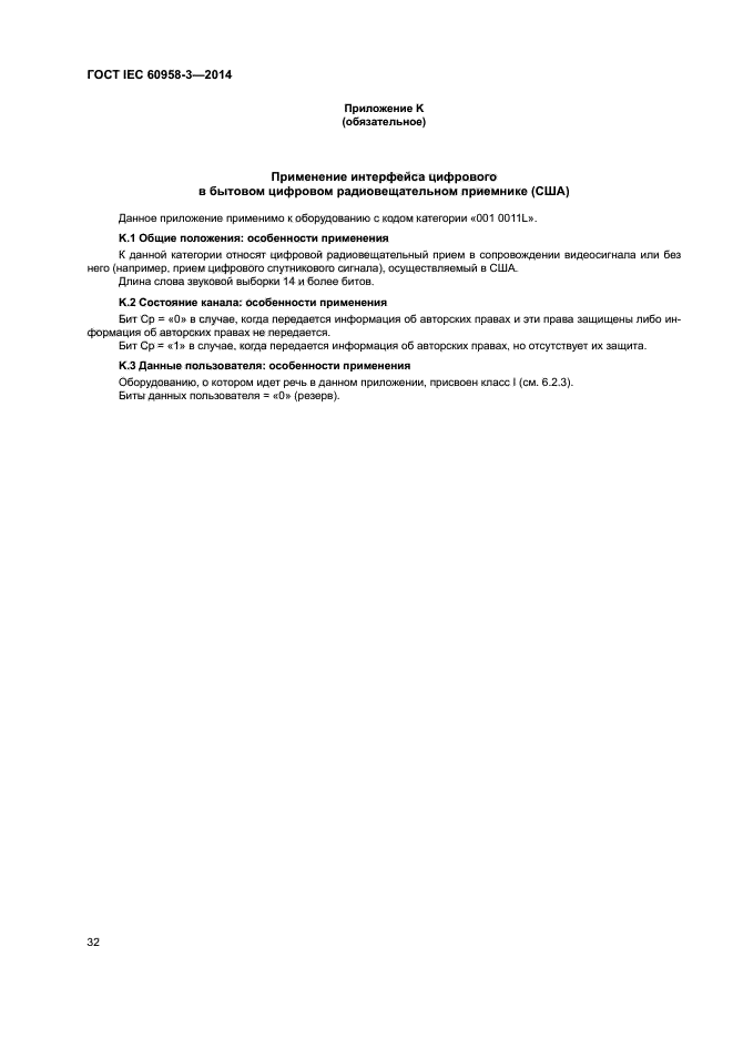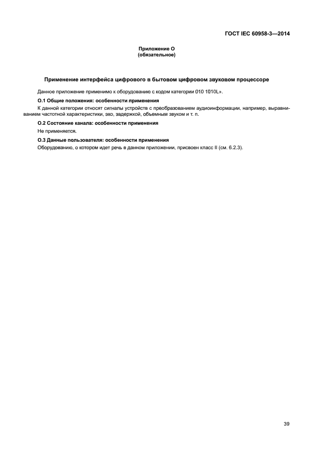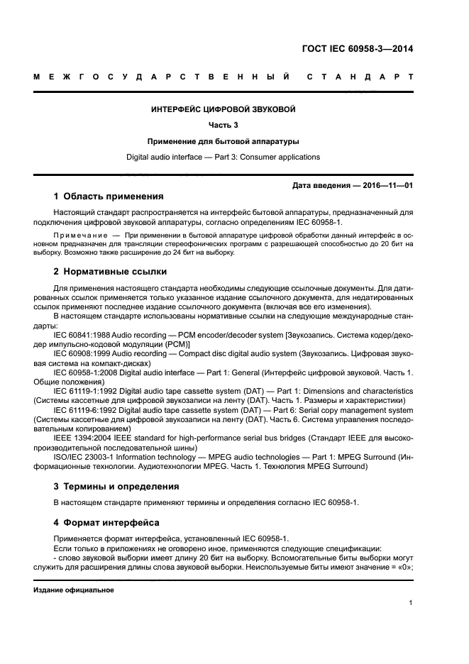 | Область и условия применения: | Настоящий стандарт распространяется на интерфейс бытовой аппаратуры, предназначенный для подключения цифровой звуковой аппаратуры, согласно определениям IEC 60958-1 |