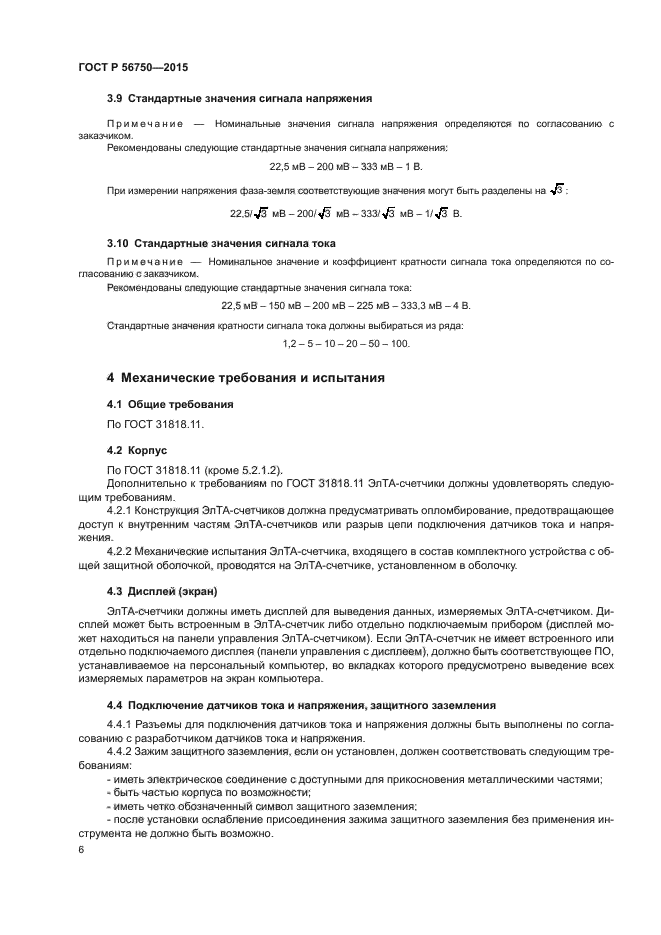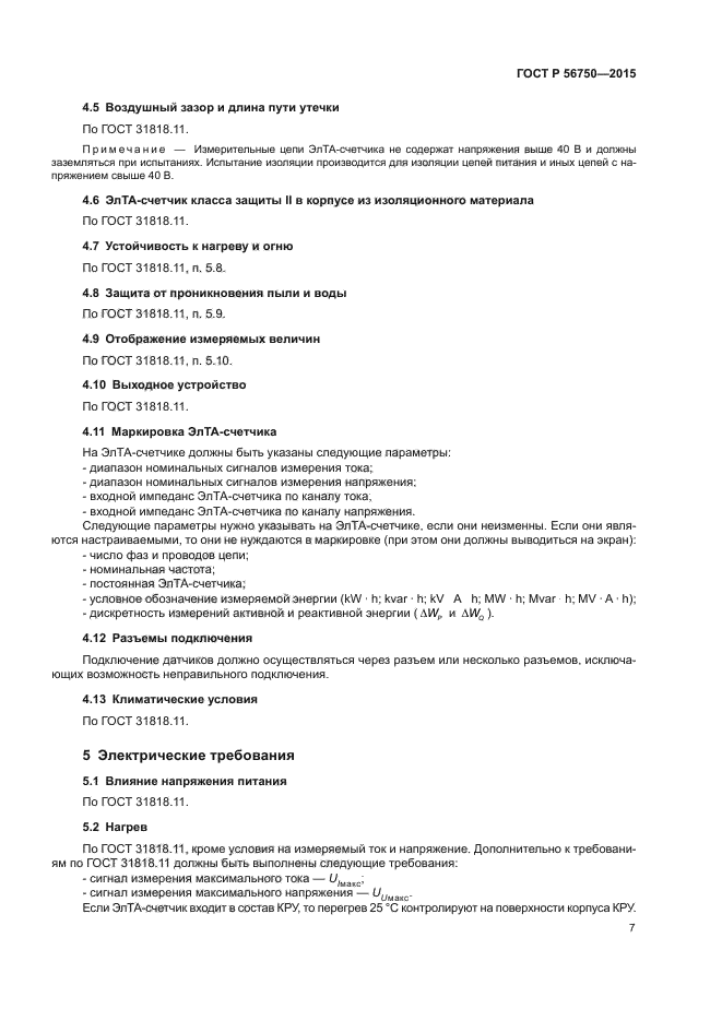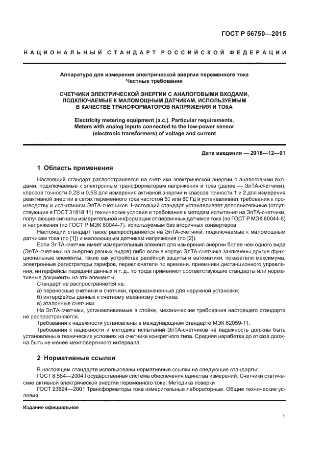 | Область и условия применения: | Настоящий стандарт распространяется на счетчики электрической энергии с аналоговыми входами, подключаемые к электронным трансформаторам напряжения и тока, классов точности 0,2S и 0,5S для измерения активной энергии и классов точности 1 и 2 для измерения реактивной энергии в сетях переменного тока частотой 50 или 60 Гц, и устанавливает требования к производству и испытаниям ЭлТА-счетчиков. Настоящий стандарт устанавливает дополнительные (отсутствующие в ГОСТ 31818.11) технические условия и требования к методам испытания на ЭлТА-счетчики, получающие сигналы измерительной информации от первичных датчиков тока (по ГОСТ Р МЭК 60044-8) и напряжения (по ГОСТ Р МЭК 60044-7), используемым без вторичных конвертеров |