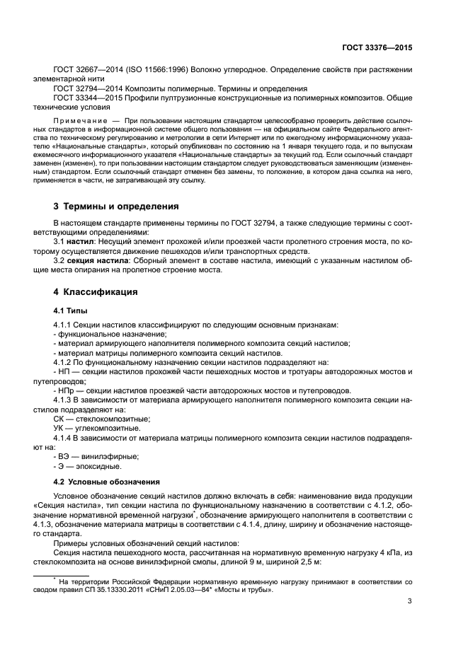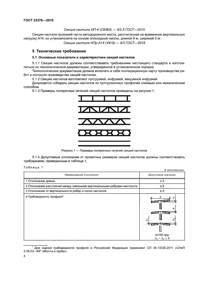| Область и условия применения: | Настоящий стандарт распространяется на композитные полимерные секции настилов для пешеходных и автодорожных мостов и путепроводов (далее - секции настилов), возводимых на автомобильных дорогах всех категорий, включая внутрихозяйственные дороги сельскохозяйственных и промышленных предприятий |