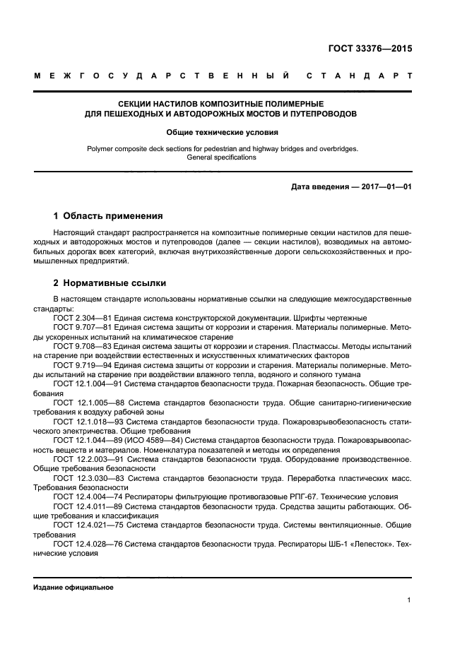 Настоящий стандарт распространяется на композитные полимерные секции настилов для пешеходных и автодорожных мостов и путепроводов (далее - секции настилов), возводимых на автомобильных дорогах всех категорий, включая внутрихозяйственные дороги сельскохозяйственных и промышленных предприятий