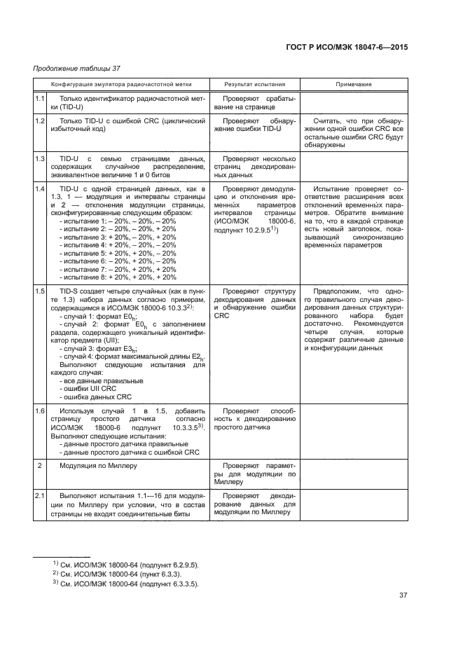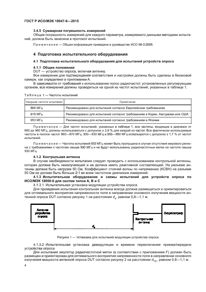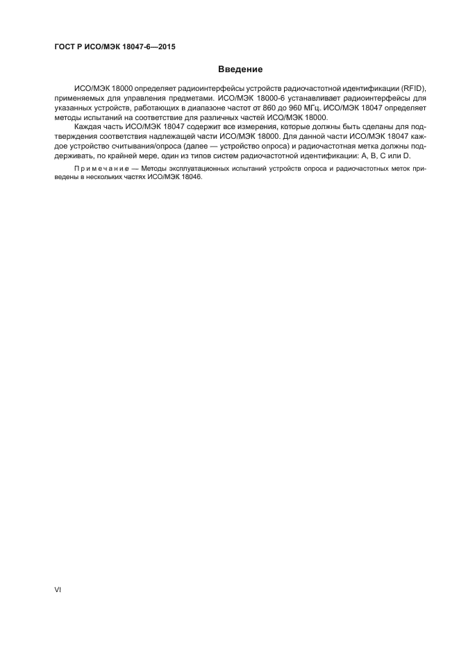 Настоящий стандарт устанавливает методы испытаний для определения соответствия устройств радиочастотной идентификации (радиочастотных меток и устройств опроса), предназначенных для управления предметами, со спецификациями, приведенными в ИСО/МЭК 18000-6, но не распространяется на испытания на соответствие требованиям регулирующего органа по использованию полос радиочастот или подобным требованиям