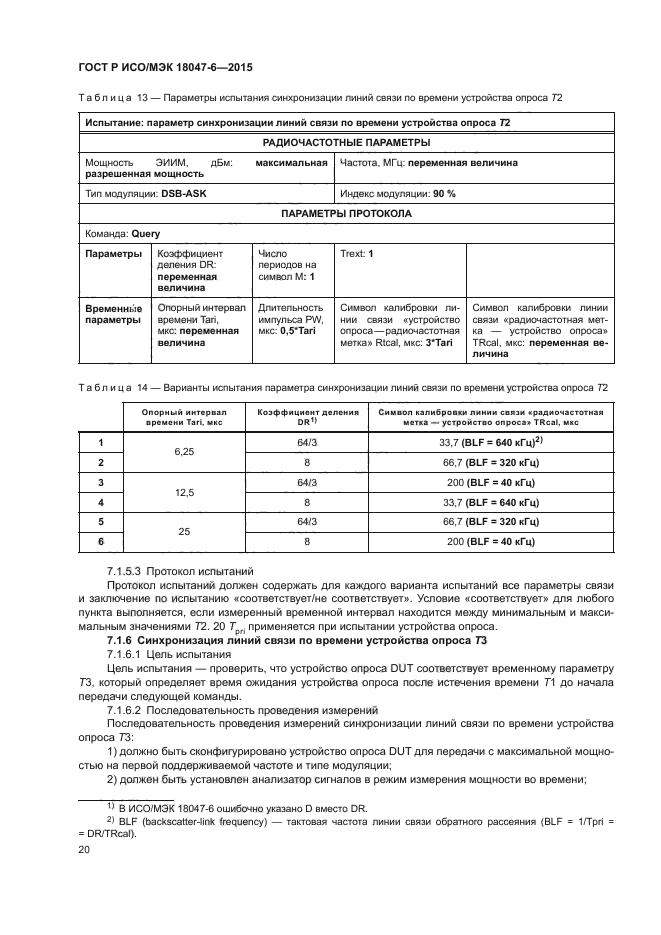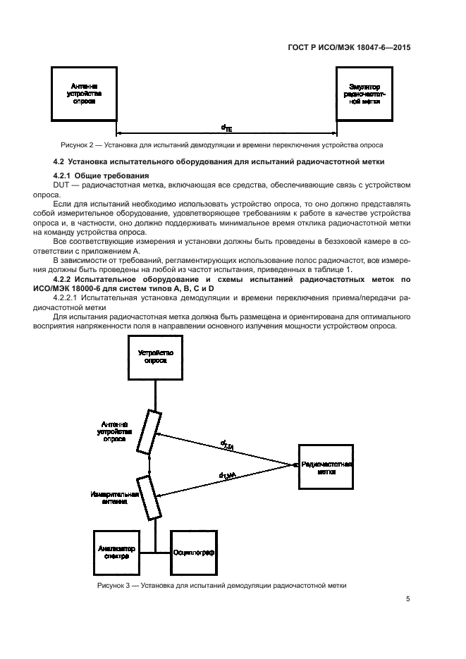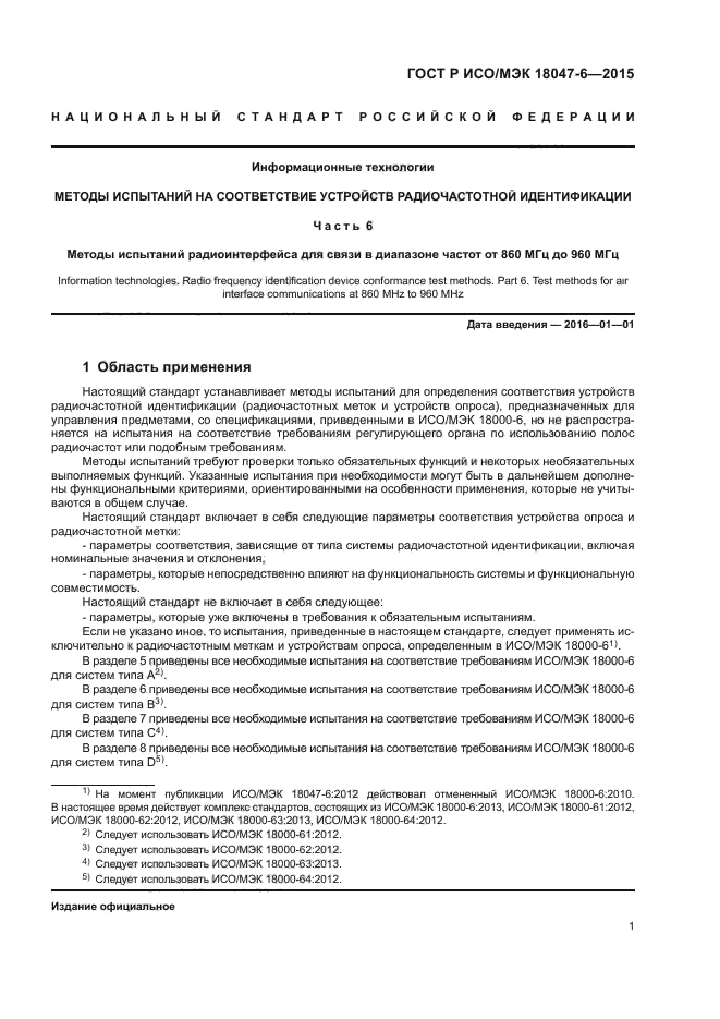 | Область и условия применения: | Настоящий стандарт устанавливает методы испытаний для определения соответствия устройств радиочастотной идентификации (радиочастотных меток и устройств опроса), предназначенных для управления предметами, со спецификациями, приведенными в ИСО/МЭК 18000-6, но не распространяется на испытания на соответствие требованиям регулирующего органа по использованию полос радиочастот или подобным требованиям |