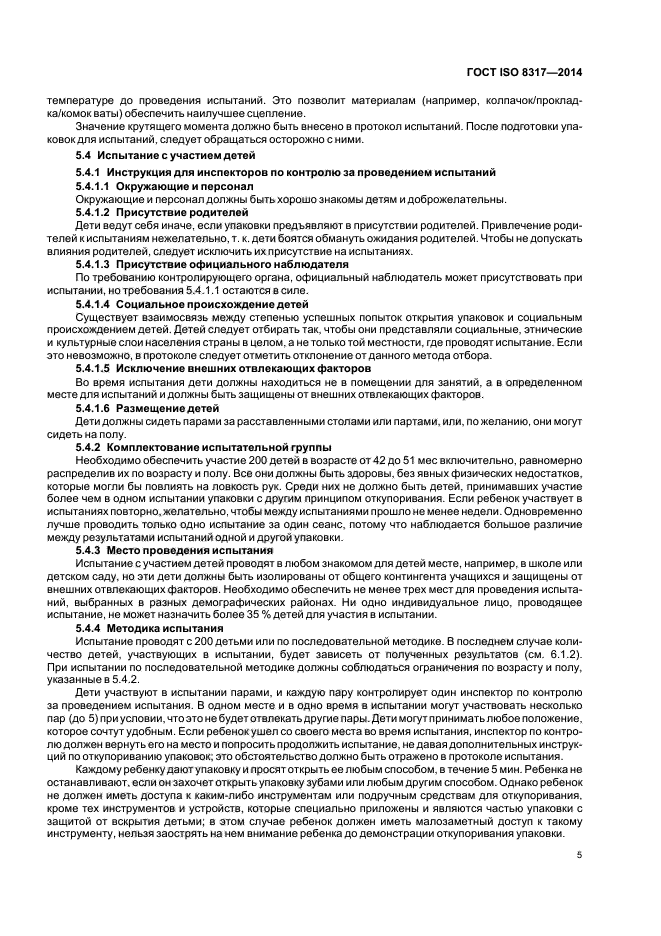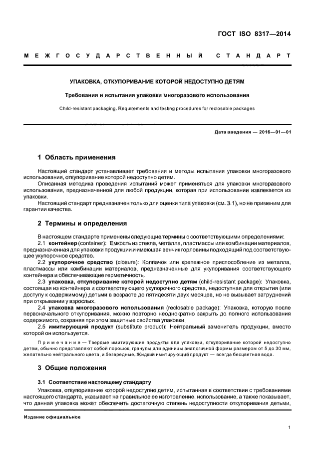 | Область и условия применения: | Настоящий стандарт устанавливает требования и методы испытания упаковки многоразового использования, откупоривание которой недоступно детям.