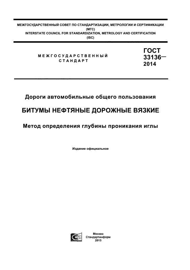Настоящий стандарт распространяется на битумы нефтяные дорожные вязкие, предназначенные в качестве вяжущего материала при строительстве, реконструкции и ремонте дорожных покрытий, и устанавливает метод определения глубины проникания иглы в испытуемый образец битума