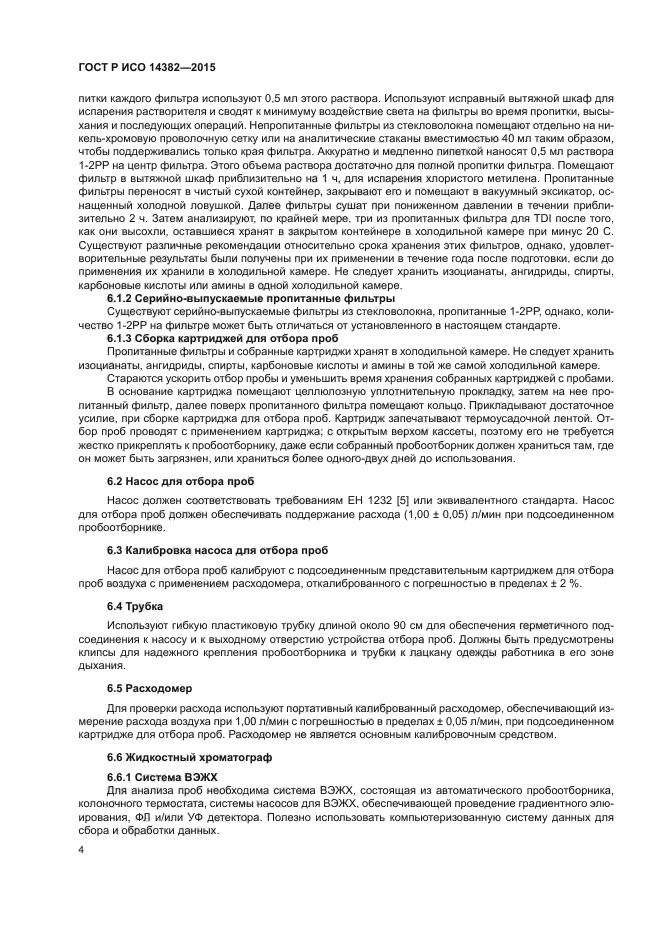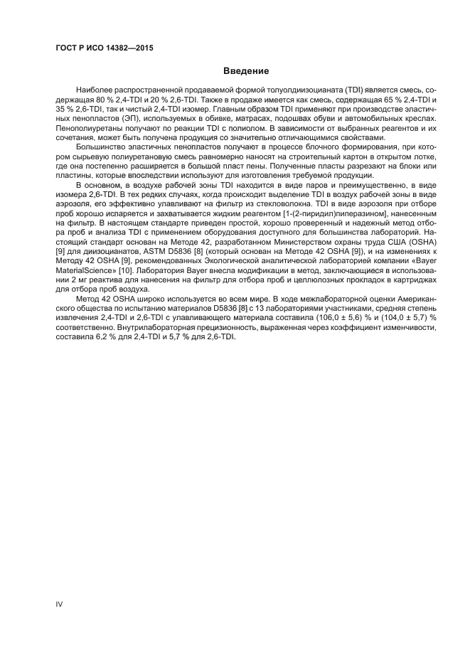 | Область и условия применения: | Настоящий стандарт устанавливает общие положения по отбору и анализу проб на содержание толуолдиизоцианата (TDI) в воздухе рабочей зоны. Методику, установленную в настоящем стандарте, применяют при кратковременном (продолжительностью 15 мин) и долговременном (продолжительностью до 4 ч) отборе проб с последующим количественным определением паров 2,4- и 2,6-TDI |
