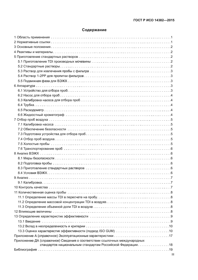 Настоящий стандарт устанавливает общие положения по отбору и анализу проб на содержание толуолдиизоцианата (TDI) в воздухе рабочей зоны. Методику, установленную в настоящем стандарте, применяют при кратковременном (продолжительностью 15 мин) и долговременном (продолжительностью до 4 ч) отборе проб с последующим количественным определением паров 2,4- и 2,6-TDI