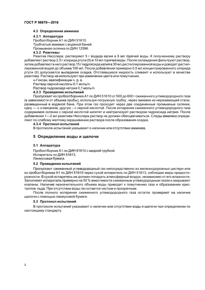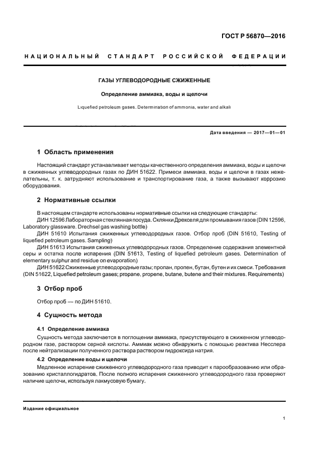 Настоящий стандарт устанавливает методы качественного определения аммиака, воды и щелочи в сжиженных углеводородных газах по ДИН 51622. Примеси аммиака, воды и щелочи в газах нежелательны, т. к. затрудняют использование и транспортирование газа, а также вызывают коррозию оборудования