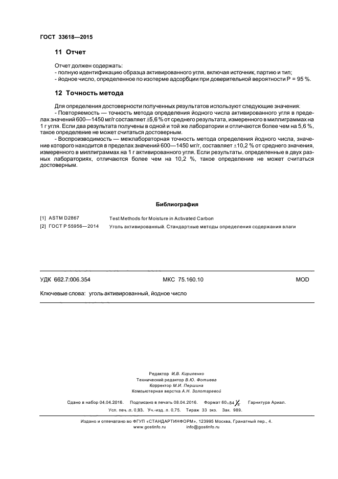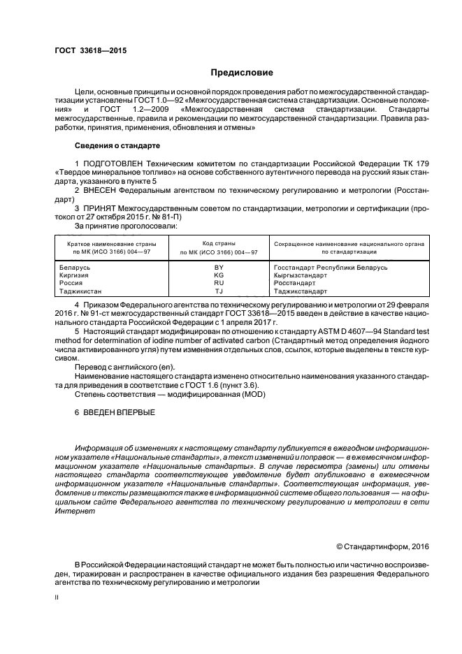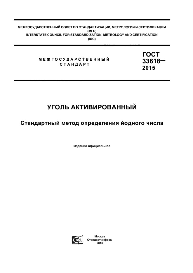 | Область и условия применения: | Настоящий стандарт распространяется на активированный и регенерированный активированный уголь и устанавливает метод определения йодного числа. Йодным числом называют количество поглощенного йода, выраженного в миллиграммах на 1 г активированного угля |