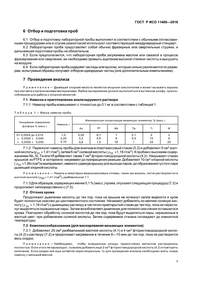 Мышьяк, хром, гафний, ниобий, кремний, тантал, титан и вольфрам оказывают мешающее влияние на определение фосфора, но помехи можно устранить, связыванием мешающих элементов в комплексные соединения или удалением, например, Cr. Определение самого низкого содержания фосфора [0,0005 % (масс.)] может быть достигнуто только в образцах с низкими содержаниями мешающих элементов |