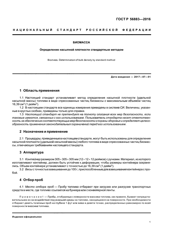 | Область и условия применения: | Настоящий стандарт устанавливает метод определения насыпной плотности (удельной насыпной массы) топлива в виде спрессованных частиц биомассы с максимальным объемом частиц 16,39 см куб. (1 дюйм куб.).